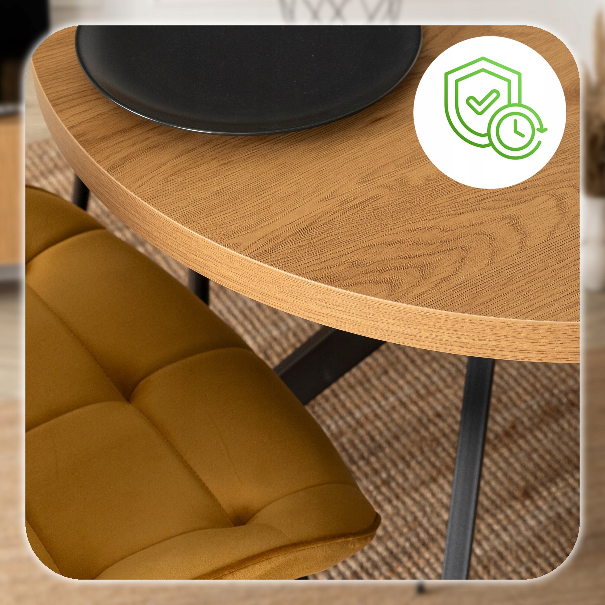 Blat stołu DORIAN został wykonany z wysokiej jakości płyty MDF w kolorze dębu, wykończonej trwałą i elegancką powłoką.