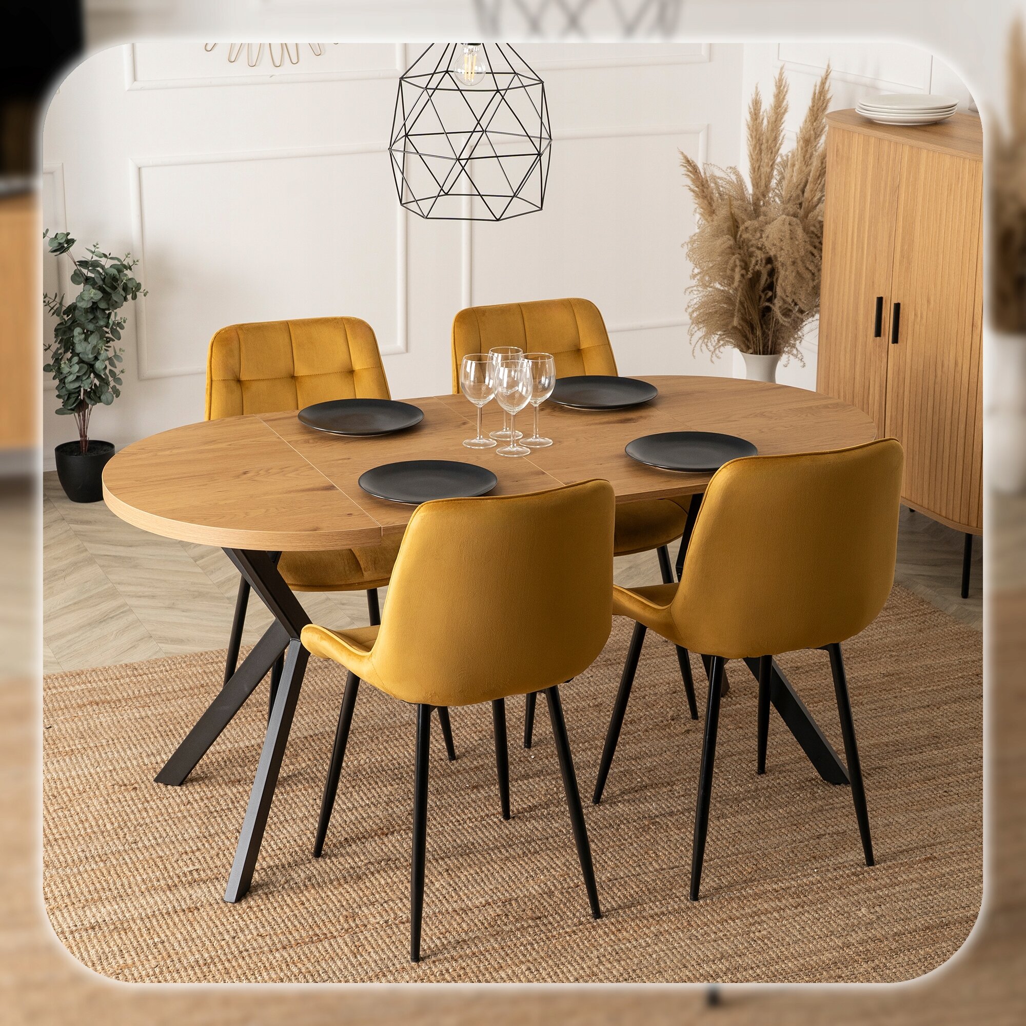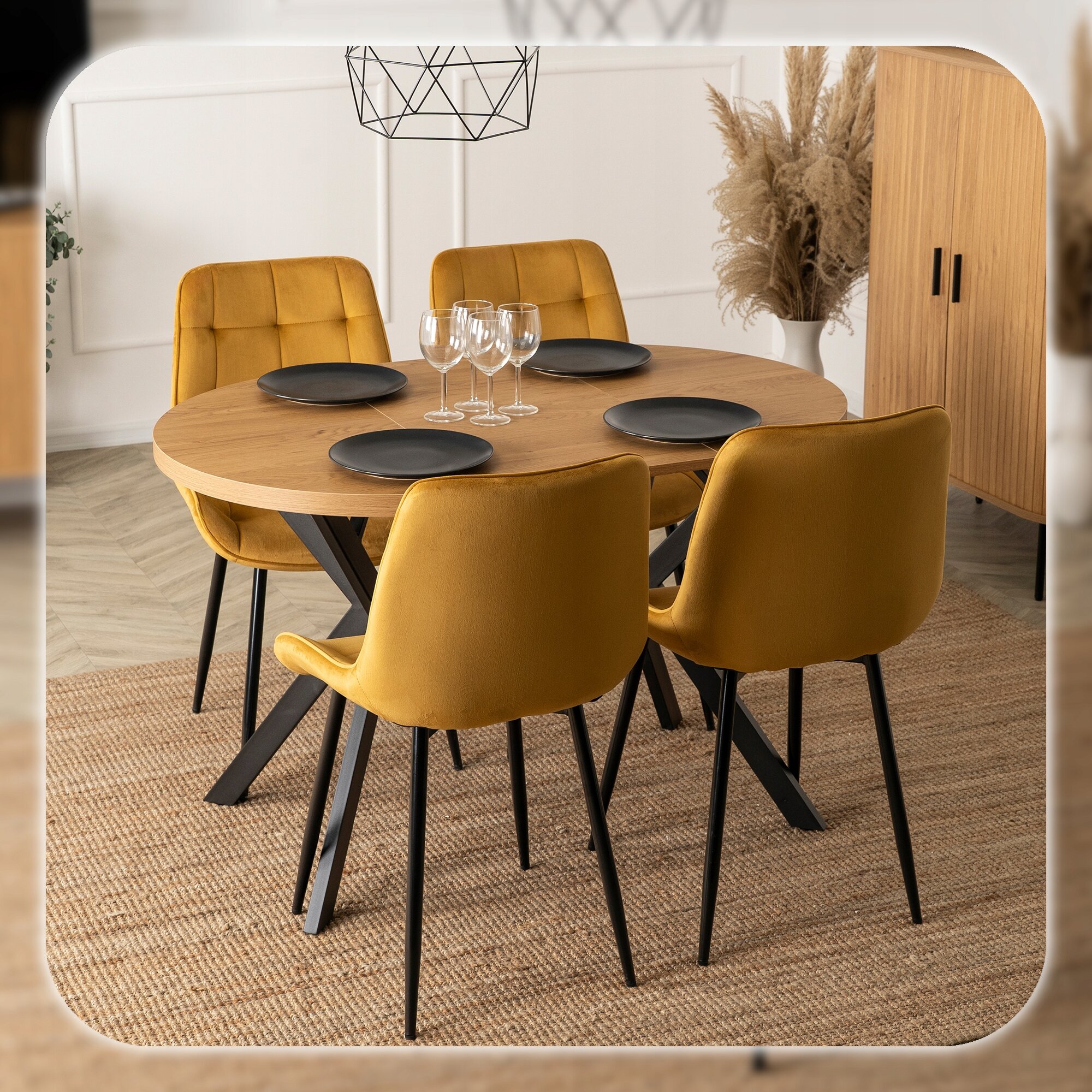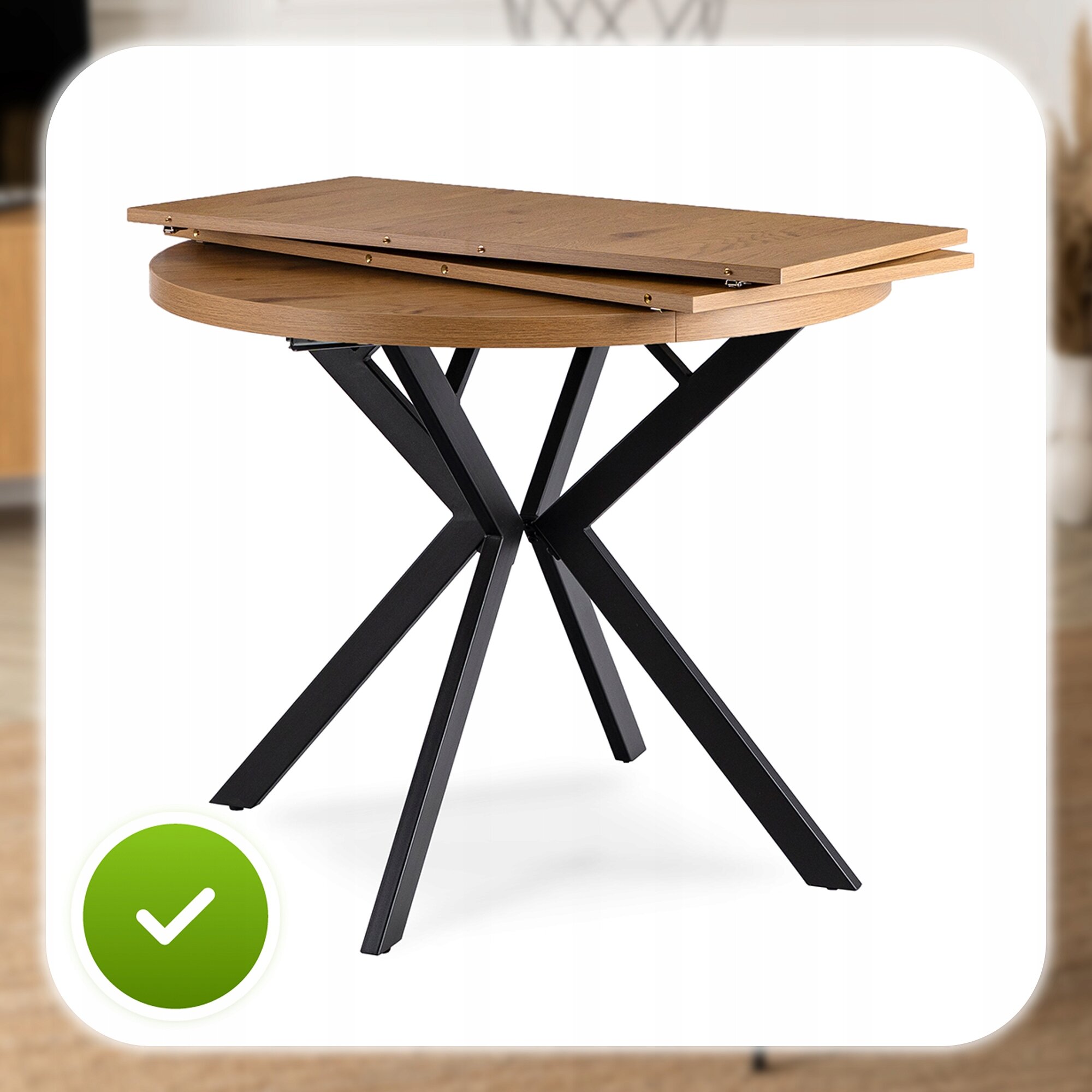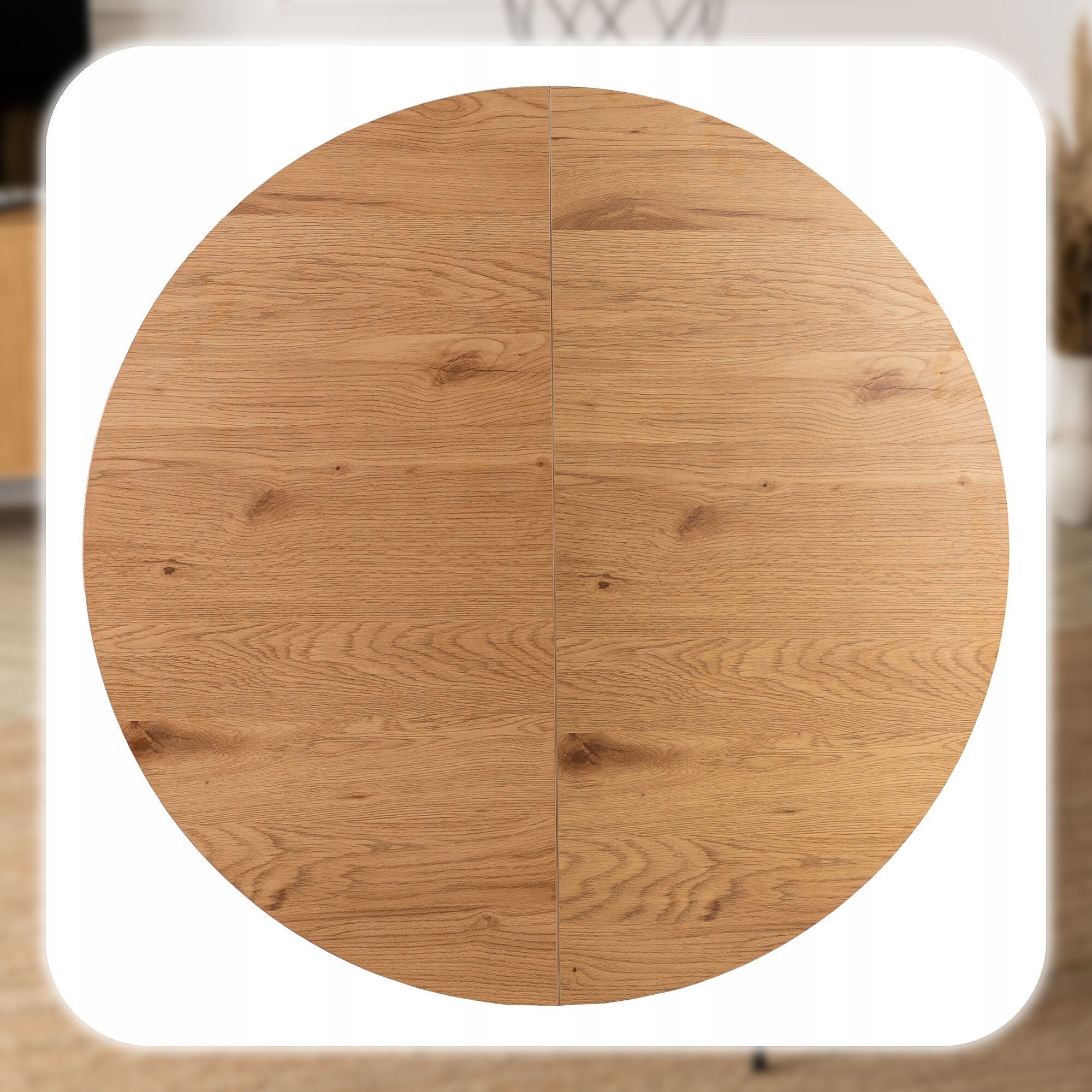 Jego rozsuwany, okrągły blat w kolorze dębu prezentuje się niezwykle elegancko i nowocześnie.