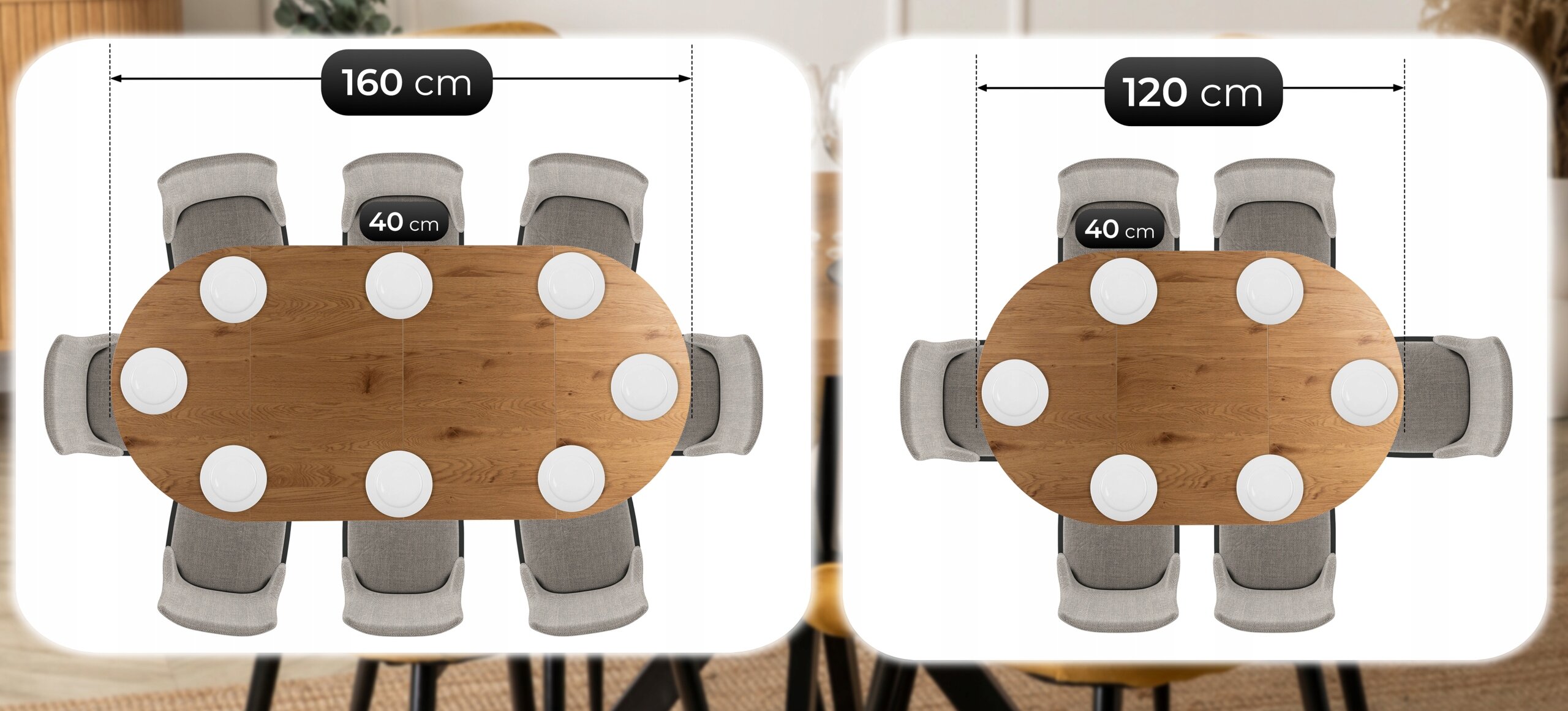 - Stół z jedną wkładką (120 cm) – wygodnie pomieści 6 krzeseł, idealnie sprawdzając się podczas codziennych posiłków lub spotkań w gronie rodziny.