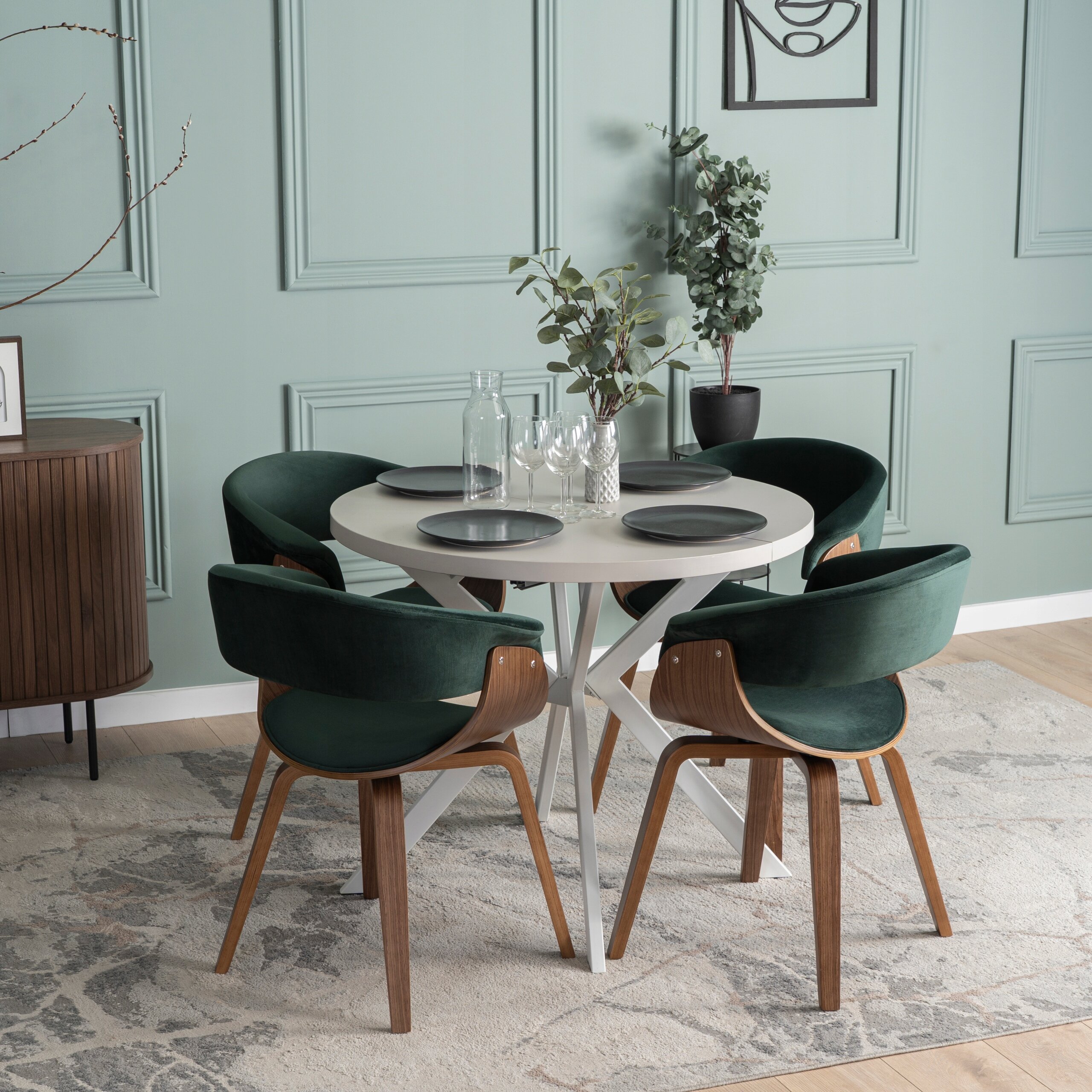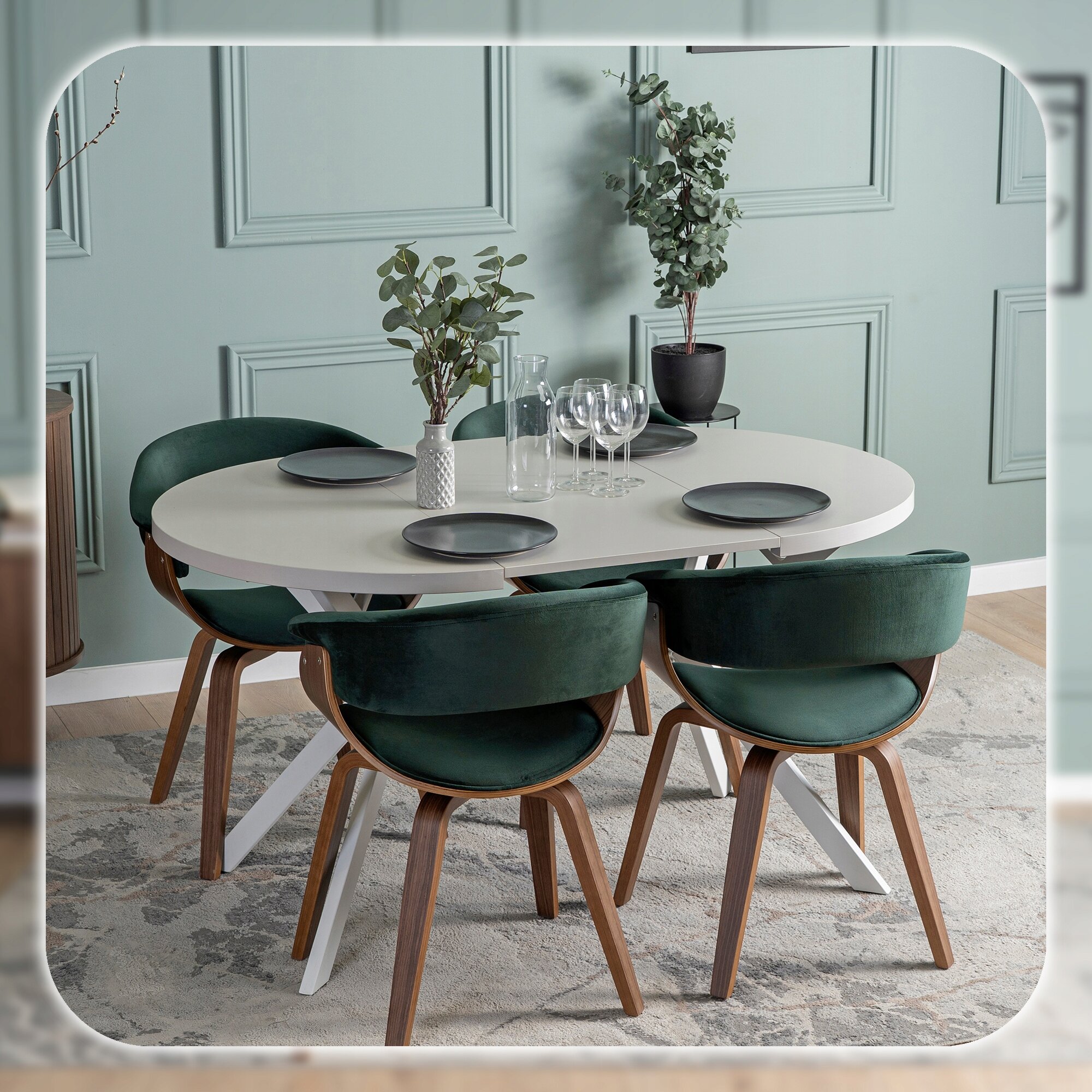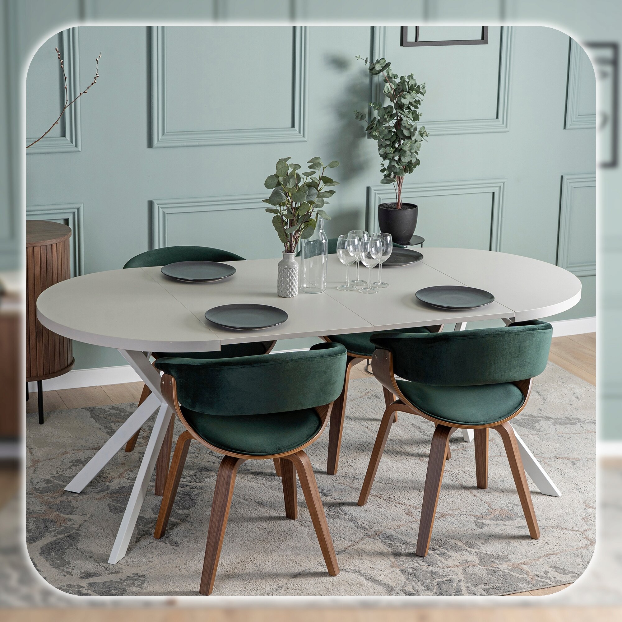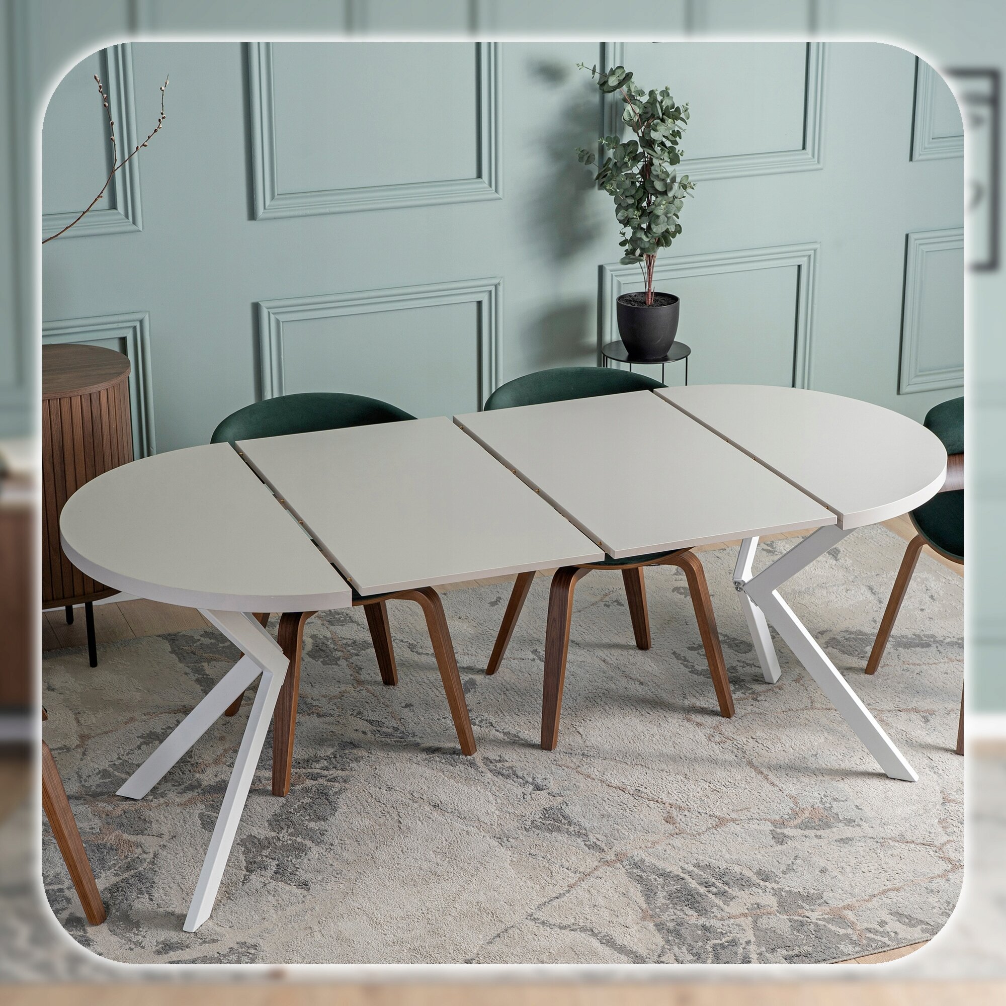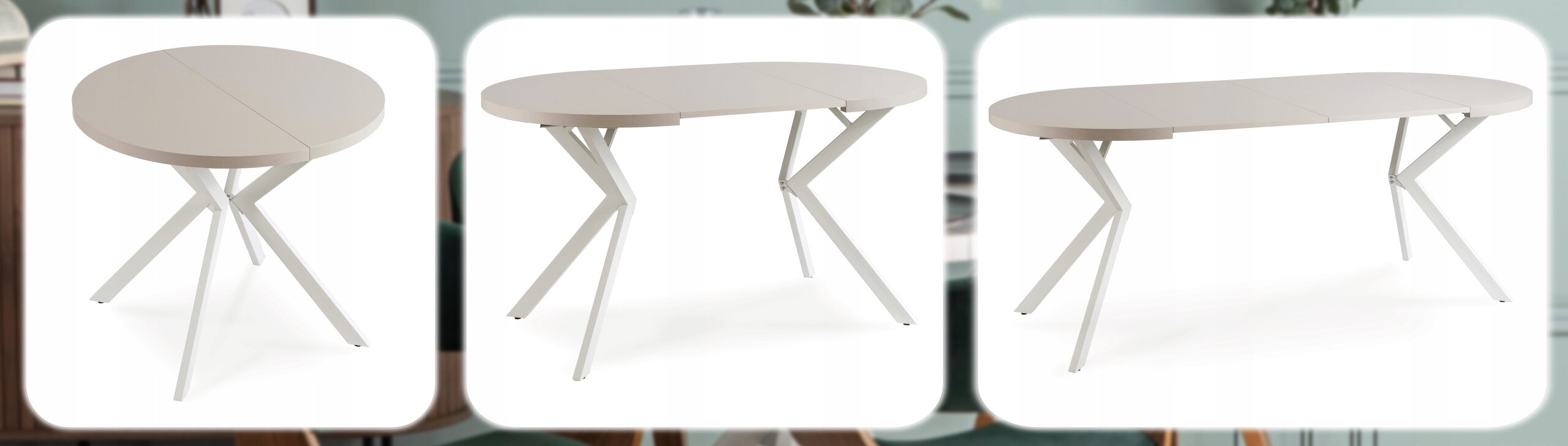Jego rozsuwany, okrągły blat w kolorze kaszmiru prezentuje się niezwykle elegancko i nowocześnie.