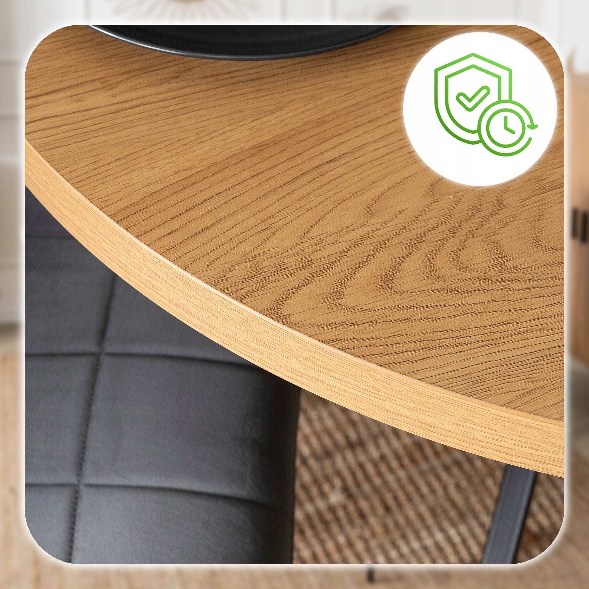 Blat stołu LUGO został wykonany z wysokiej jakości płyty MDF w kolorze dębowym, wykończonej trwałą i elegancką powłoką.