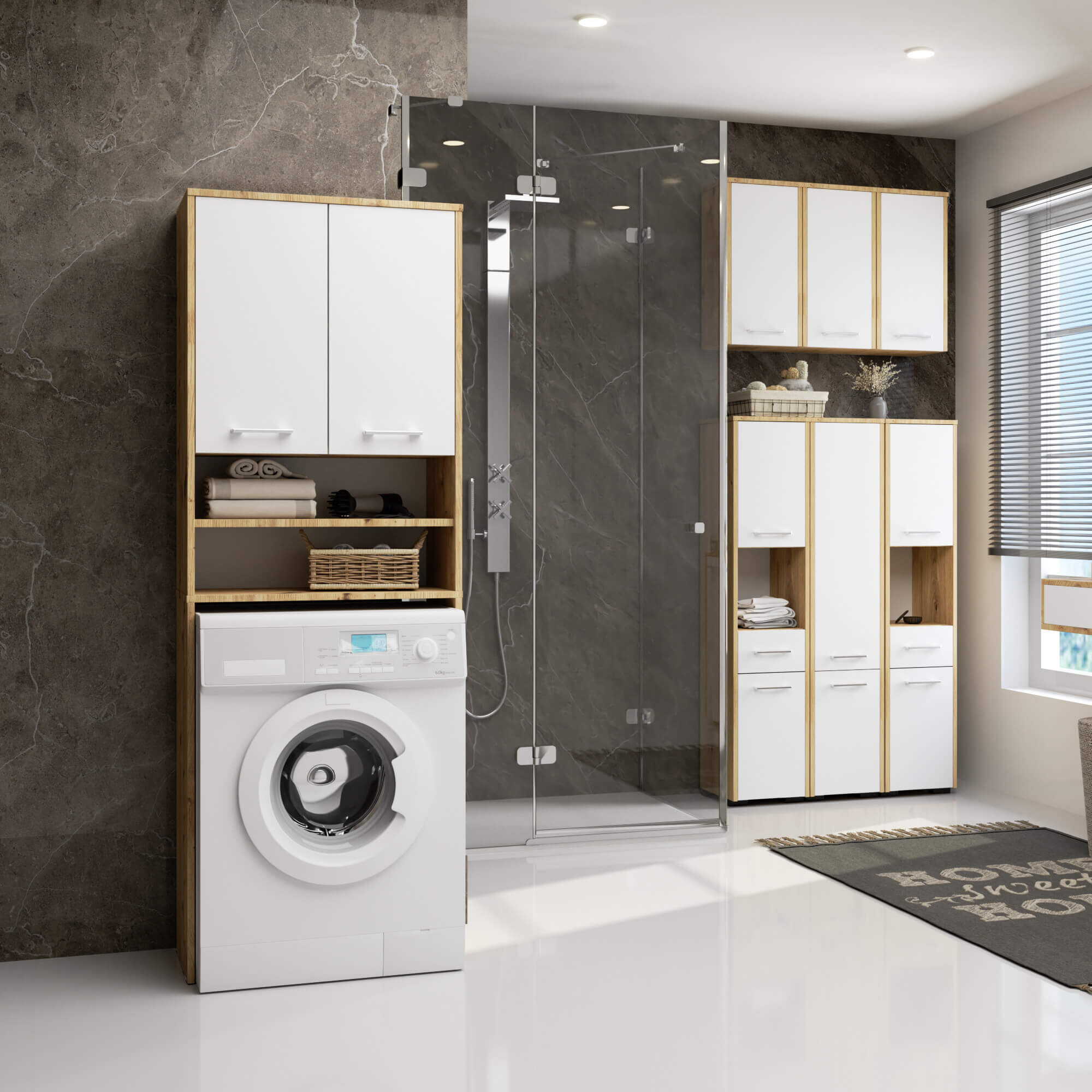- FUNKCJONALNY UKŁAD: Szafka montowana nad pralką wyposażona jest w schowek z dwoma drzwiami oraz dwie otwarte półki, które zapewniają dużo miejsca na detergenty, bieliznę czy środki czystości.
