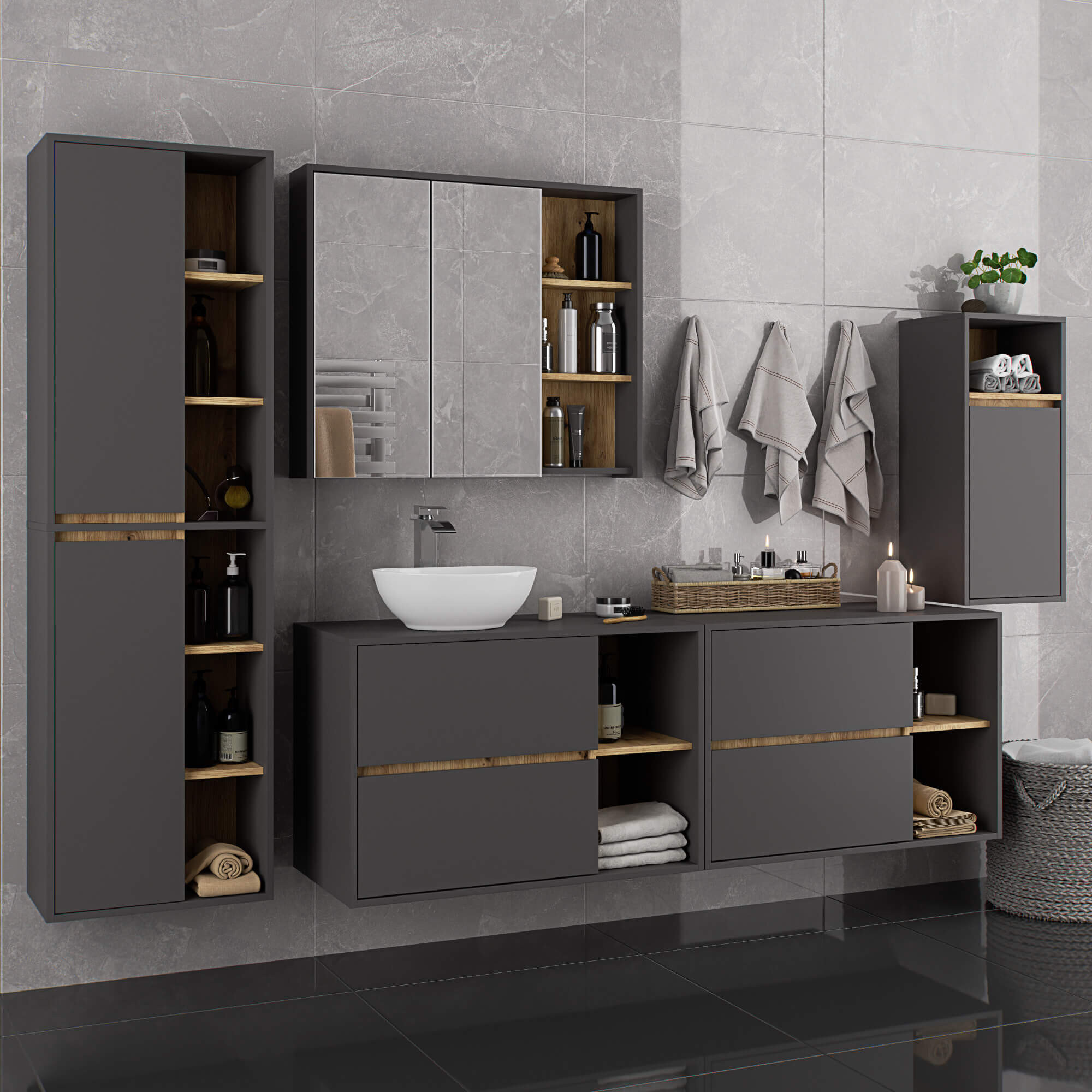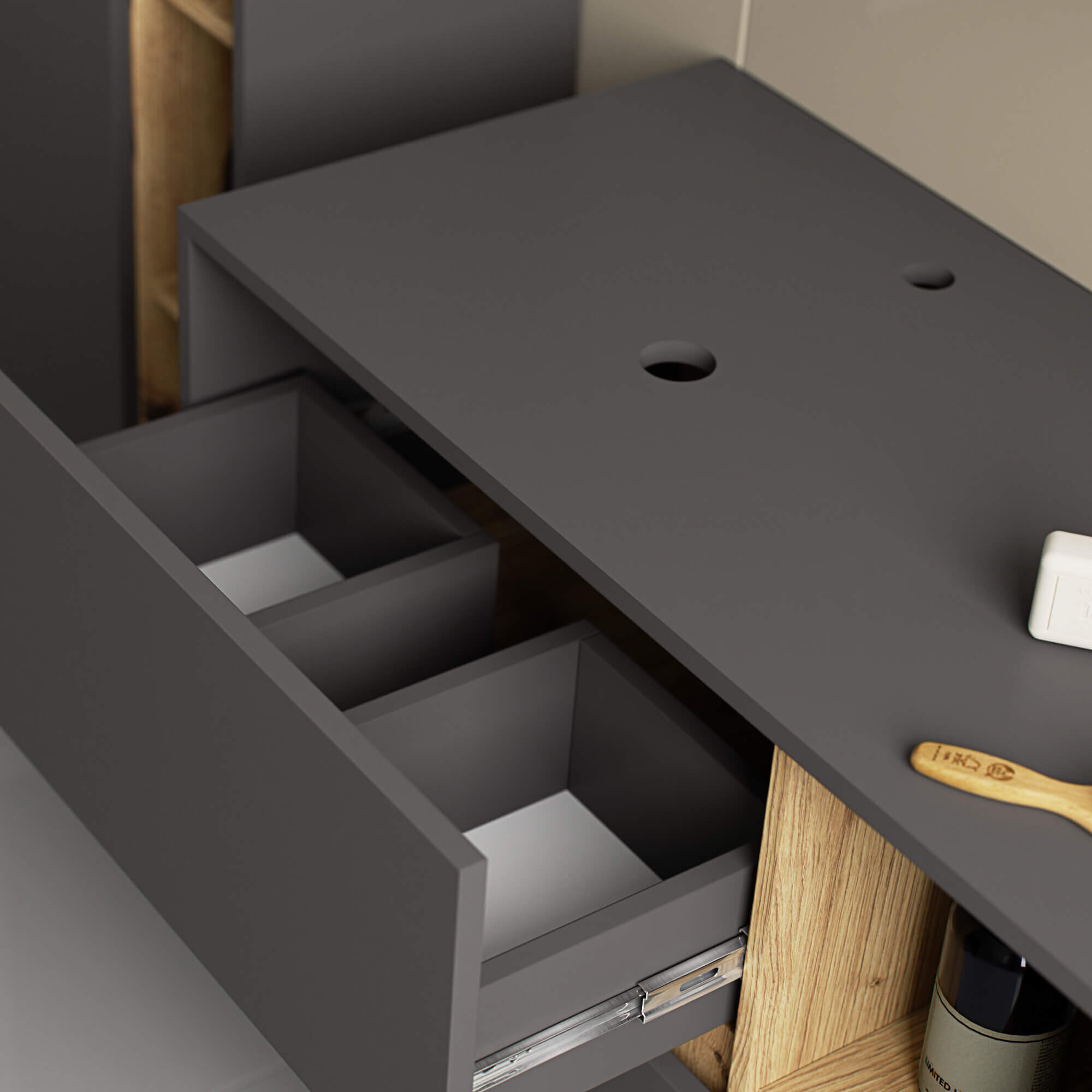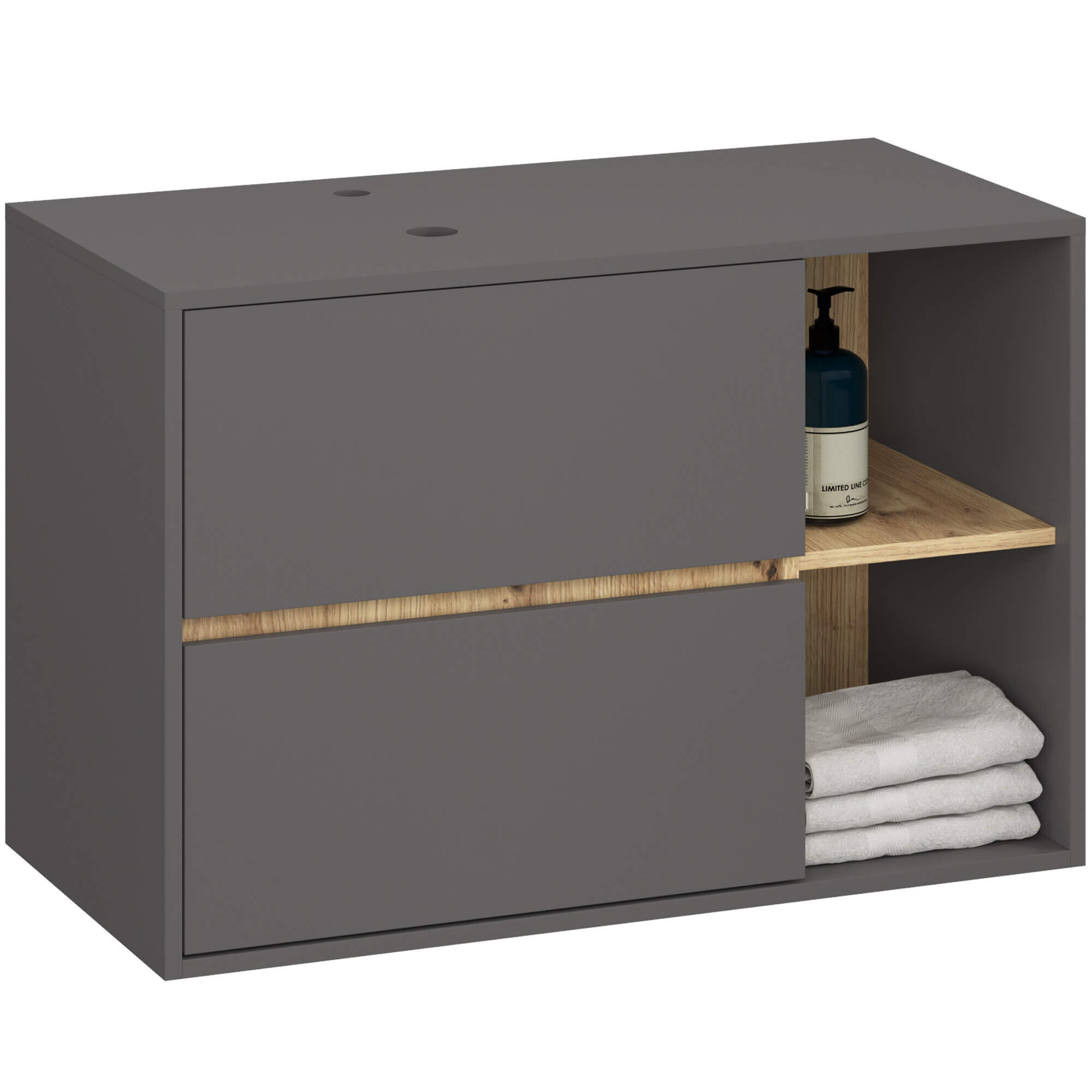 - Szafka łazienkowa pod umywalkę z otworami AKORD VAMI Grafit Szary, Dąb Artisan 90 cm 2 szuflady 2 półki 90x60x45,5 cm