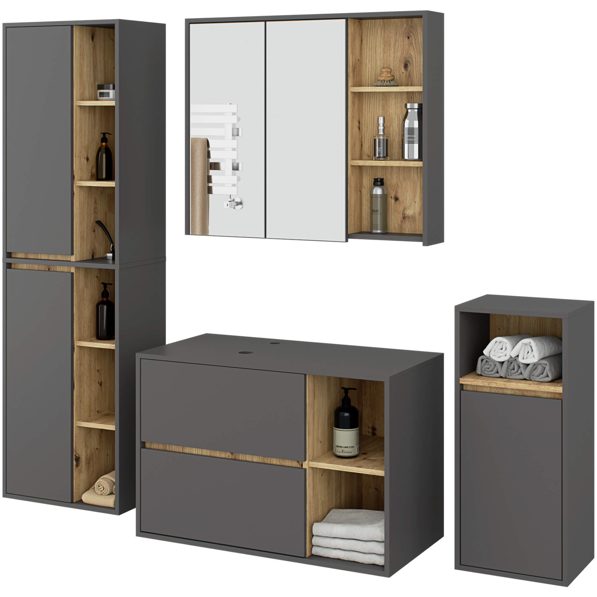 - Zestaw mebli łazienkowych wiszących z otworami AKORD VAMI Grafit Szary, Dąb Artisan 5 drzwi 21 półek 2 szuflady