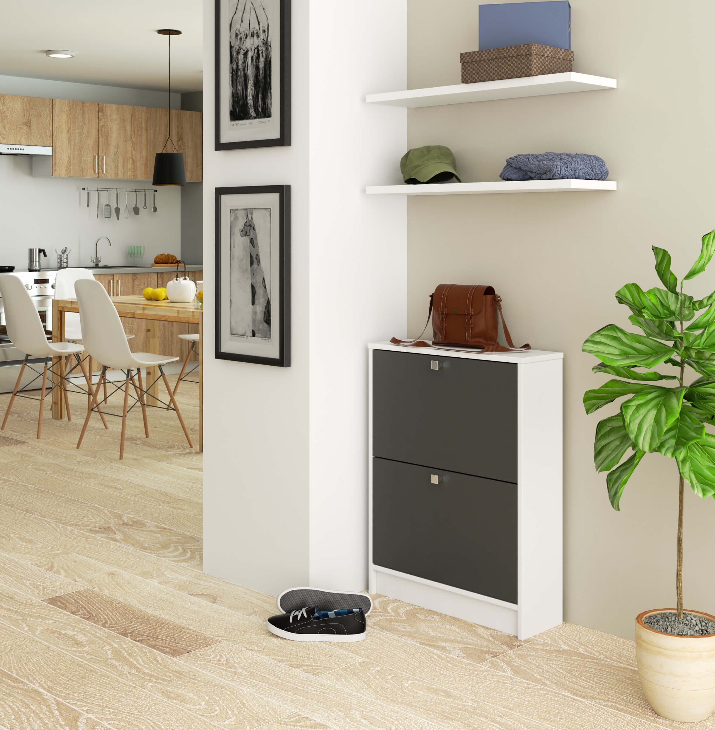 - KLASYCZNA: Wąska szafka na buty o eleganckim i klasycznym designie jest idealna do przedpokoju, korytarza lub holu. Dwa uchylne schowki na buty oferują wystarczająco dużo miejsca na Twoje sandały, buty sportowe i botki.