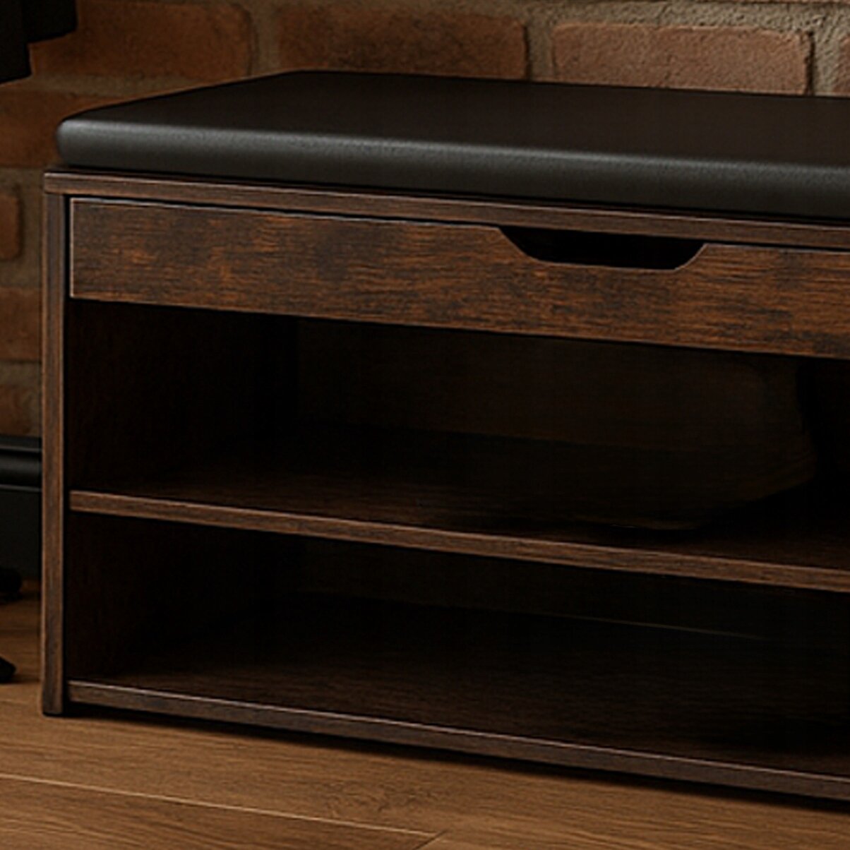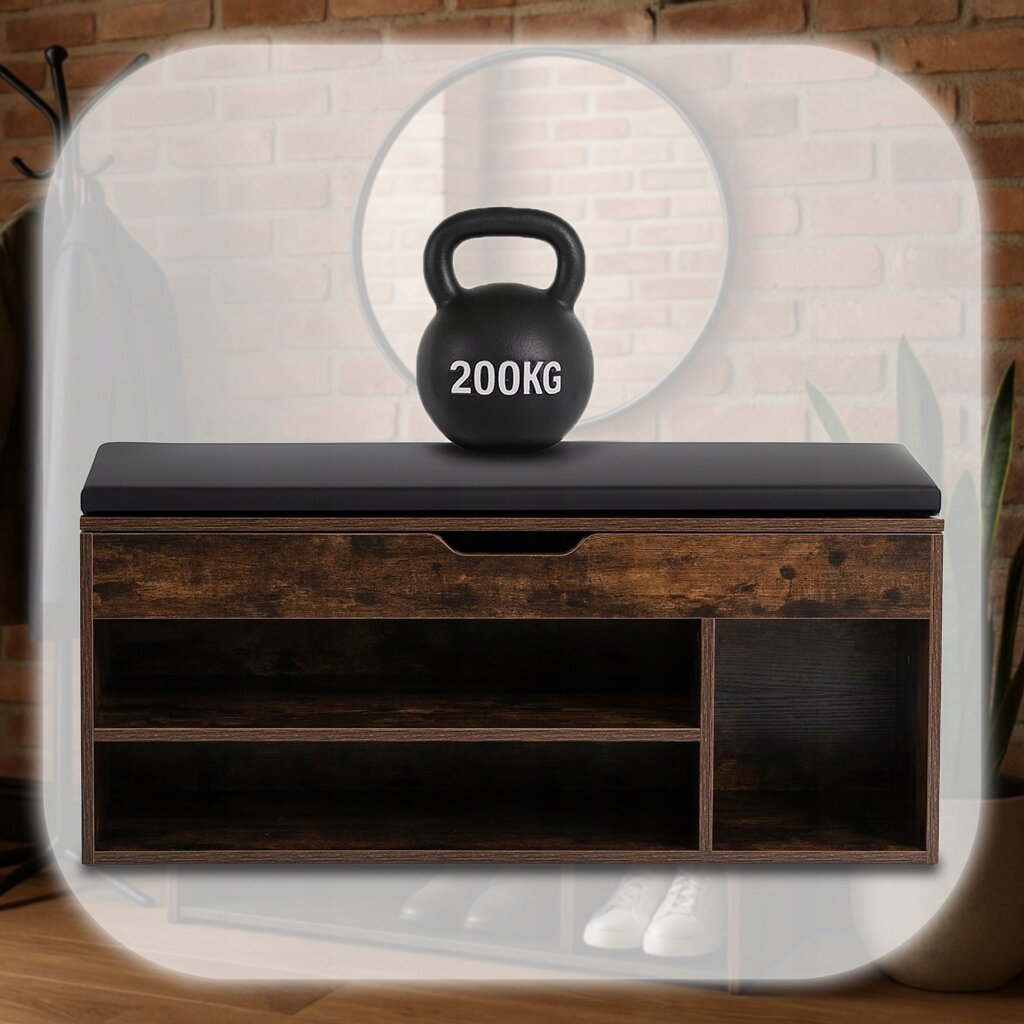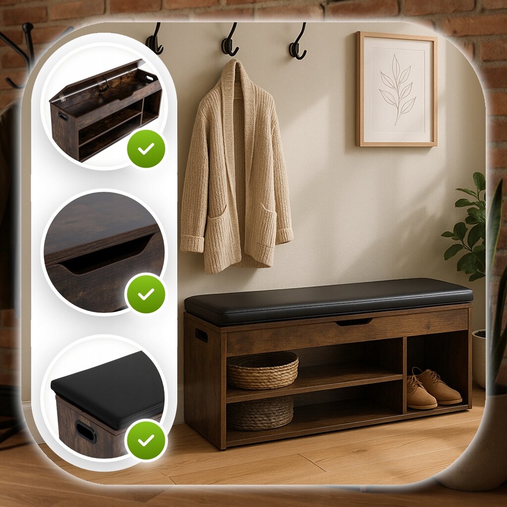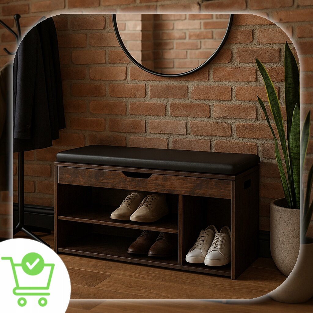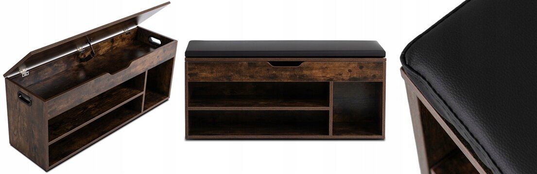 Elegancka i funkcjonalna szafka na buty z wygodnym siedziskiem. Wykończenie w kolorze rustykalnego dębu wprowadza do wnętrza ciepły, naturalny klimat, a czarna poduszka z ekoskóry zapewnia komfort podczas siadania i łatwe utrzymanie w czystości.