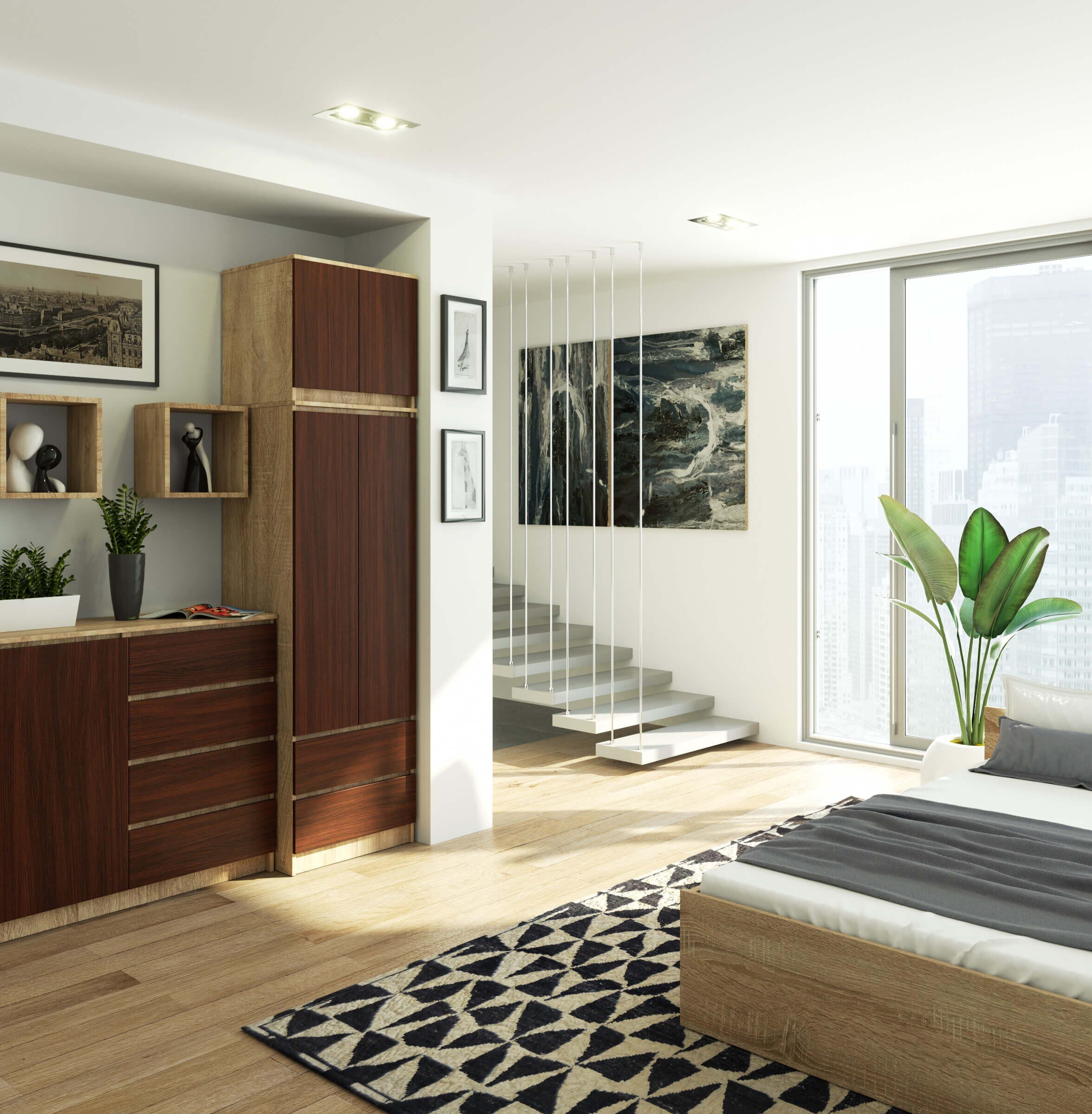 Nadstawka na szafę S60 w kolorze dąb Sonoma z wewnętrzną półką i podwójnymi drzwiczkami w kolorze wenge. Idealne uzupełnienie szafy do przedpokoju (jako część szafy na ubrania), sprawdzi się również jako pakowny dodatek do szafy do sypialni – na pościel, ręczniki, dodatkowe koce itp. Oferta dla klientów szukających większej przestrzeni ładunkowej kosztem oszczędności miejsca na podłodze. To dobry koncept również dla rozważających montaż zabudowy pod sufit. Wysokość zestawu z szafą wynosi 235 cm, dzięki czemu można sprawdzić jak użytkuje się bardzo wysokie meble, a jednocześnie nie ma jeszcze potrzeby sięgnięcia po drabinkę. Produkt przeznaczony jest do samodzielnego montażu. W dobrze zorganizowanym domu nie może zabraknąć funkcjonalnych szaf, dzięki którym zachowanie porządku staje się dużo łatwiejsze, a wnętrze zyskuje schludny wygląd. Można je postawić nie tylko w sypialni czy w pokoju nastolatka, ale również w salonie lub w przedpokoju jako praktyczne miejsce do odkładania odzieży wierzchniej, czapek, szalików, a nawet butów. Nawet niewielka szafa może zaoferować sporą przestrzeń do przechowywania ubrań i rozmaitych dodatków. Warunkiem jest odpowiednio zaprojektowany układ wnętrza, który zapewni dużo miejsca na drobiazgi, jak również na większe przedmioty.
