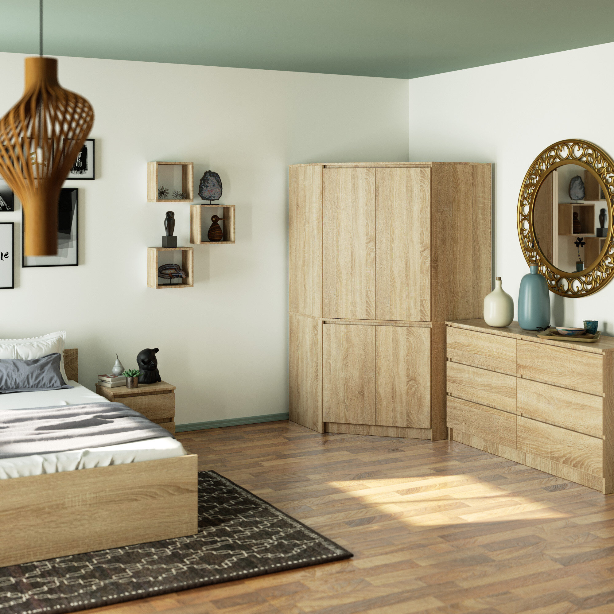 Tradycyjne szafy do sypialni nie sprawdzają się dobrze na każdej przestrzeni. W małym pomieszczeniu zdecydowanie lepiej spisze się nowoczesna szafa narożna. Jest to funkcjonalny i bardzo ustawny mebel, który pozwoli optymalnie zagospodarować przestrzeń w sypialni. Szafa narożna garderoba S100 nie zajmuje dużo miejsca, a mimo tego oferuje niezwykle pojemne wnętrze. Szafa charakteryzuje się przemyślanym układem półek, posiada też praktyczny drążek na ubrania. Stawiając szafę w narożniku pokoju, zyskujesz więcej przestrzeni np. na inne meble lub dekoracje. Szafa narożna dąb sonoma pięknie komponuje się z naturalnymi materiałami, tworząc pełen ciepła, przyjazny wystrój. Szafa drewnopodobna doskonale wpisuje się w najnowsze trendy w aranżacjach wnętrz. Śmiało można zestawiać ją także z meblami w innych kolorach, np. białym lub grafitowym. W takich pomieszczeniach jak sypialnia, pokój dziecka czy też przedpokój, niezbędnym elementem wyposażenia jest szafa. Ma ona za zadanie umożliwić domownikom wygodne przechowywanie osobistych rzeczy. Dzięki pojemnym szafom każdy przedmiot w pokoju ma swoje miejsce, a wnętrze wygląda czysto i elegancko.
