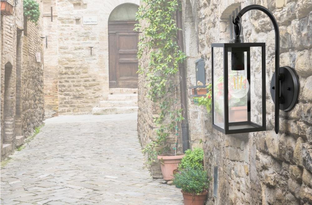 Kinkiet LED GOLDLUX Malmo 309174 o wymiarach: 120 x 245 x 345 mm z jednym źródłem światła jest idealną lampą elewacyjną. Wykonany jest z aluminium z dodatkiem szkła, co dodaje mu uroku i stylu, przypominając elegancki lampion. Lampa wyposażona jest w rodzaj gwintu E27. Źródło światła może być wymienne o max. mocy do 15 W LED. Brak żarówki w zestawie. Dodatkowo - kinkiet wyposażony jest w wysoką normę szczelności (IP44), dzięki czemu jest w pełni odporny na warunki atmosferyczne i temperaturę (-20°C / +45°C). Dodatkowo - minimalna odległość od oświetlonego przedmiotu wynosi 0,5 metra.