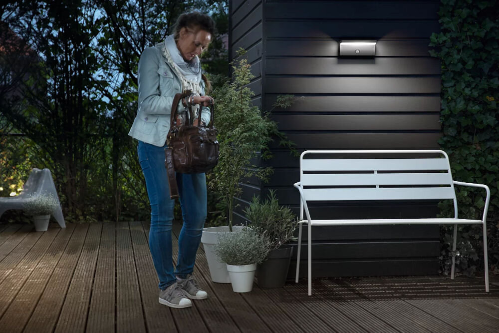 Czujnik ruchu automatycznie włącza światło, kiedy wykryje aktywność, dzięki czemu oświetli Ci drogę, gdy wieczorem wrócisz do domu. Dioda LED w lampie PHILIPS Bustan zapewnia natychmiastowe włączenie, optymalną wydajność oświetlenia oraz żywe, wyraźne kolory. Kinkiet emituje światło o mocy 1000 lumenów o chłodnej, białej barwie.