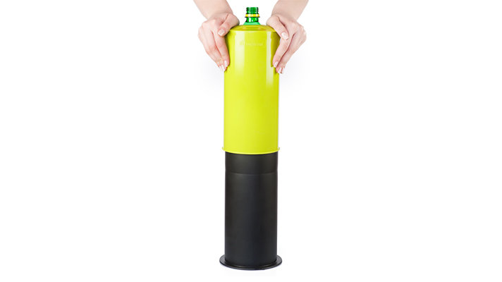 Dzięki specjalnemu krążkowi, który znajdziesz wewnątrz, możesz z łatwością dopasować zgniatarkę do różnych wielkości butelek.