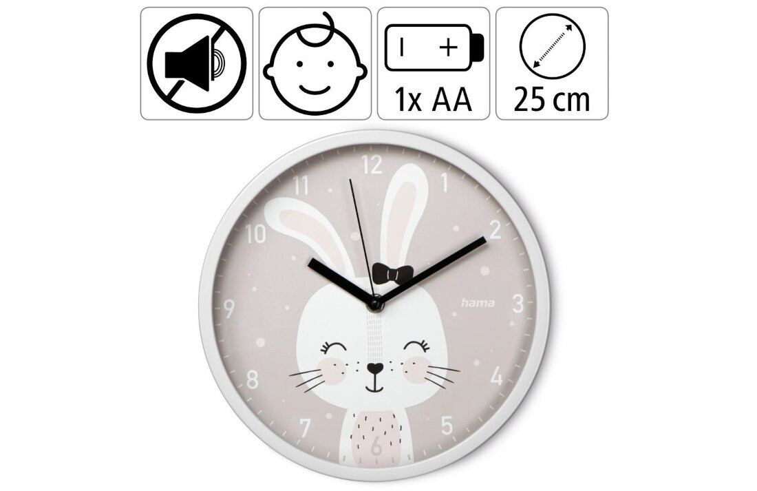 Zegar Lovely Bunny od Hama wyposażono w czytelną tarczę o średnicy 25 centymetrów. Posiada on wskazówki godziny, minut oraz sekund – dziecko bez trudu odnajdzie na zegarku odpowiednie cyfry i odczyta aktualną porę. Dużym atutem akcesorium jest niezwykle cicha praca – to zasługa mechanizmu zegarowego z pełzającym sekundnikiem. Niechciane odgłosy tykania nie zmącą więc ani spokojnego snu Twojego dziecka, ani zabawy lub nauki.