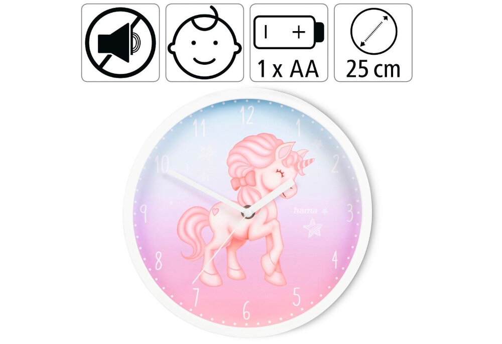 Zegar Magical Unicorn od Hama wyposażono w czytelną tarczę o średnicy 25 centymetrów. Posiada on wskazówki godziny, minut oraz sekund – dziecko bez trudu odnajdzie na zegarku odpowiednie cyfry i odczyta aktualną porę. Dużym atutem akcesorium jest niezwykle cicha praca – to zasługa mechanizmu zegarowego z pełzającym sekundnikiem. Niechciane odgłosy tykania nie zmącą więc ani spokojnego snu Twojego dziecka, ani zabawy lub nauki.