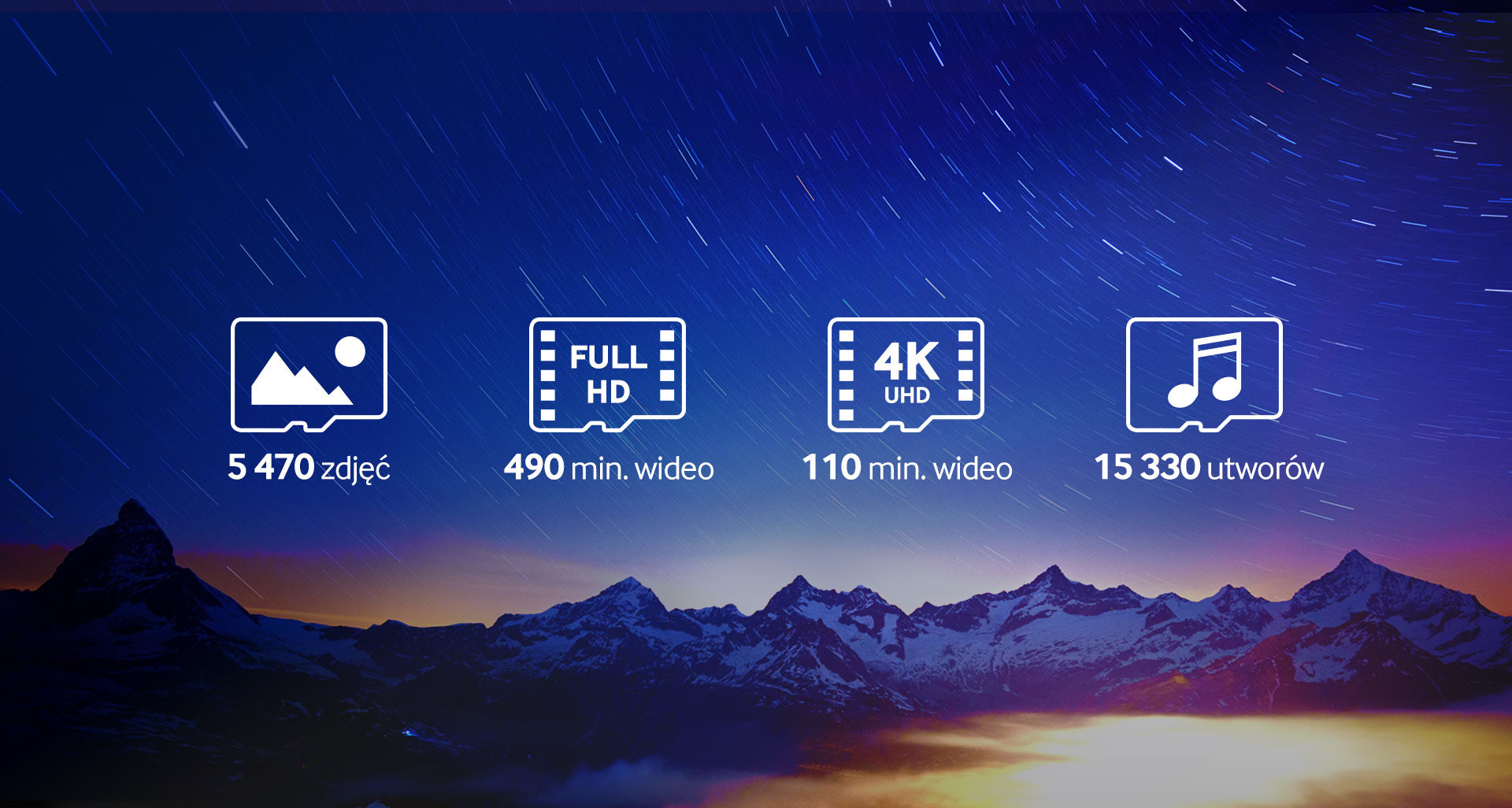 | Niewiarygodna pojemność Zapisz ponad 5 470 zdjęć¹, 490 minut nagrań wideo w trybie Full HD², 110 minut nagrań wideo 4K UHD³ lub 15 330 piosenek⁴.* Pobieraj więcej plików multimedialnych i aplikacji na smartfon, tablet lub aparat obsługujący wideo w rozdzielczości 4K UHD. I zawsze miej dużo miejsca.** |