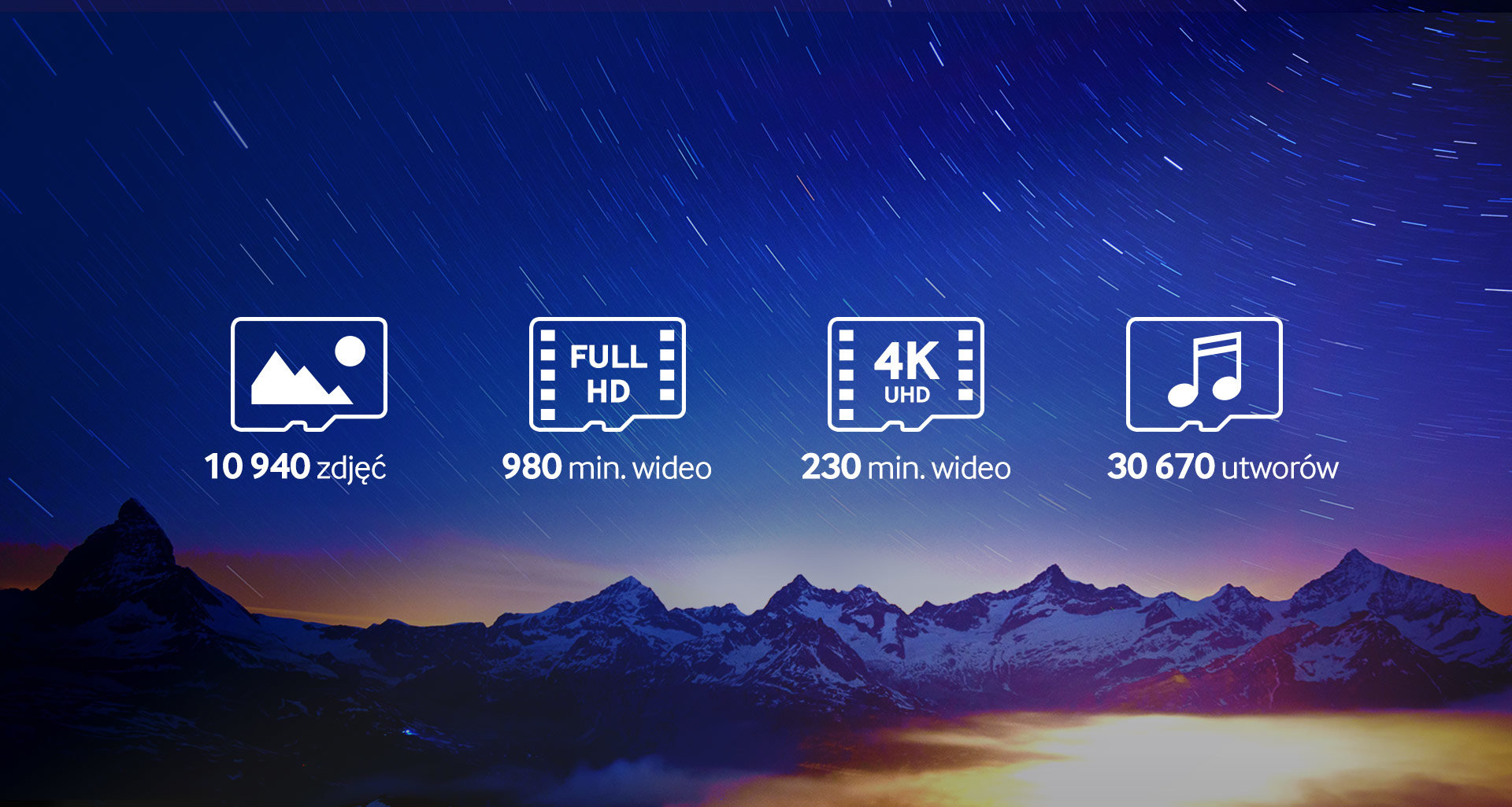 | Niewiarygodna pojemność Zapisz ponad 10 940 zdjęć¹, 980 minut nagrań wideo w trybie Full HD², 230 minut nagrań wideo 4K UHD³ lub 30 670 piosenek⁴.* Pobieraj więcej plików multimedialnych i aplikacji na smartfon, tablet lub aparat obsługujący wideo w rozdzielczości 4K UHD. I zawsze miej dużo miejsca.** |