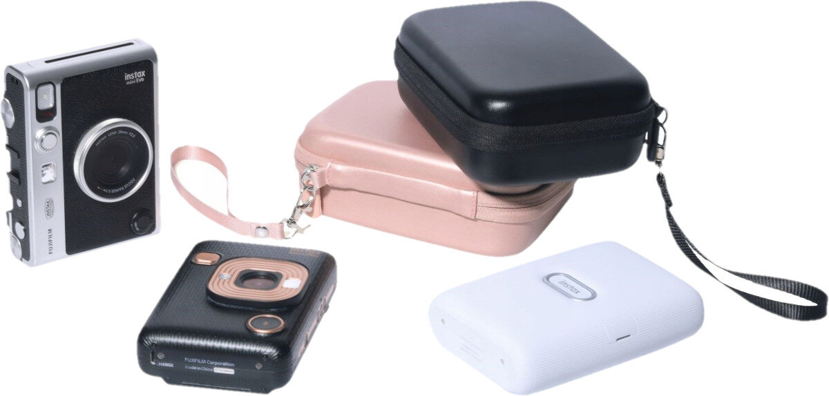 Wszystkie przegrody wewnątrz pokrowca zostały zaprojektowane tak, aby idealnie pasowały pod aparat oraz dedykowane akcesoria dodatkowe. Wewnątrz jest także miejsce na akcesoria, takie jak zdjęcia, karty pamięci lub inne drobiazgi. Pokrowiec dedykowany jest aparatom FUJIFILM Instax Mini Evo, Mini LiPlay oraz drukarkom Mini Link i Mini Link 2.