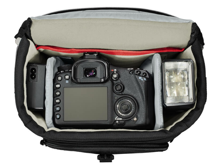 W głównej komorze z 2 ruchomymi przegrodami zmieścisz swoją ulubioną lustrzankę, kamerę lub kompaktowy aparat cyfrowy oraz baterię lub dodatkową lampę i obiektyw. Pod pokrywą głównej komory znajduje się dodatkowa kieszonka zapinana na zamek na drobne akcesoria. Całe wnętrze jest wyściełane miękkim materiałem, który zapewnia odpowiednią ochronę dla delikatnego sprzętu. Z przodu torby jest płaska przegroda na zamek ze strukturą organizera wewnątrz, w którym możesz wygodnie przechowywać karty pamięci i inne drobiazgi. Dodatkowo na bokach torby są małe siatkowe kieszonki, do których możesz włożyć akcesoria, które chcesz mieć zawsze pod ręką. Pod tymi kieszeniami znajdziesz elastycznie regulowane uchwyty do statywu. A z tyłu torby w płaskiej kieszeni możesz umieścić niezbędne dokumenty.