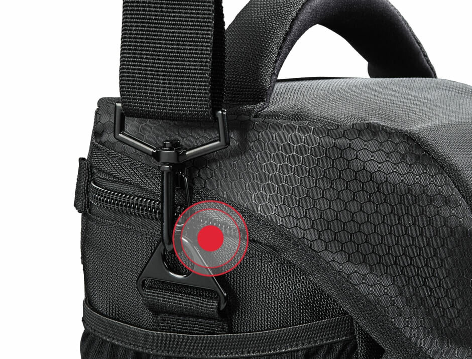Torba ma małą rączkę do przenoszenia oraz odczepiany, regulowany pas z miękką wyściółką do noszenia jej na ramieniu. Dodatkowo na tyle torby jest jeszcze szlufka, która umożliwia przymocowanie torby do rączki walizki. Przegroda jest zapinana na podwójne zamki błyskawiczne, dzięki czemu można szybko dostać się do zawartości torby. Całość wykonana jest z solidnych i jednocześnie lekkich materiałów, dzięki czemu korzystanie z torby jest bardzo komfortowe. Aby zapewnić maksymalne bezpieczeństwo Twojego sprzętu, torba została wyposażona w zintegrowany pokrowiec przeciwdeszczowy, a jej podstawa jest wykonana ze zmywalnego materiału.