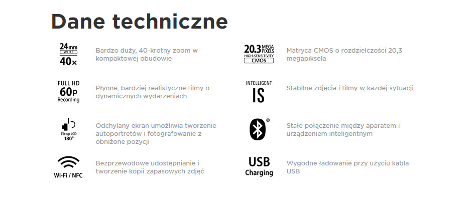 Doskonałe zdjęcia – w dzień i w nocy Rozwiązanie HS System, charakteryzujące się rozdzielczością 20,3 MP, zapewnia znakomite, wyraźne zdjęcia z podróży w dzień i w nocy. Funkcja szybkiej serii zdjęć umożliwia spontaniczne rejestrowanie dynamicznych wydarzeń, a odchylany ekran LCD – tworzenie autoportretów. |