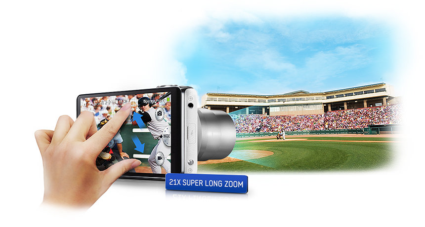 21-krotny zoom optyczny Super Long z funkcją Pinch Zoom Zachowaj opcję zoomu cyfrowego do edycji zdjęć po ich zrobieniu. 21-krotny zoom Super Long w aparacie GALAXY Camera 2 jest w 100% optyczny. Intuicyjna funkcja Pinch Zoom umożliwia przybliżanie i oddalanie obrazu poprzez proste uszczypnięcie ekranu palcami. 21-krotny zoom Super Long i funkcja Pinch Zoom pozwolą ci przybliżyć wymarzony kadr, zachowując doskonałą jakość obrazu, zupełnie jakby fotografowany obiekt znajdował się blisko aparatu.