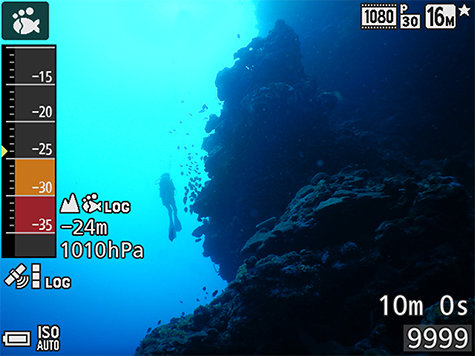 Aparat pozwala na śledzenie wysokości n.p.m. lub głębokości pod wodą za pomocą dwufunkcyjnego czujnika wysokości/głębokości. Nowy przycisk narzędziowy umożliwia błyskawiczne wyświetlenie na monitorze współrzędnych GPS, wysokości n.p.m./głębokości lub ciśnienia powietrza/wody. Informacje o wysokości n.p.m. i głębokości zapisane podczas fotografowania mogą być uwzględnione w danych obrazu (EXIF). |