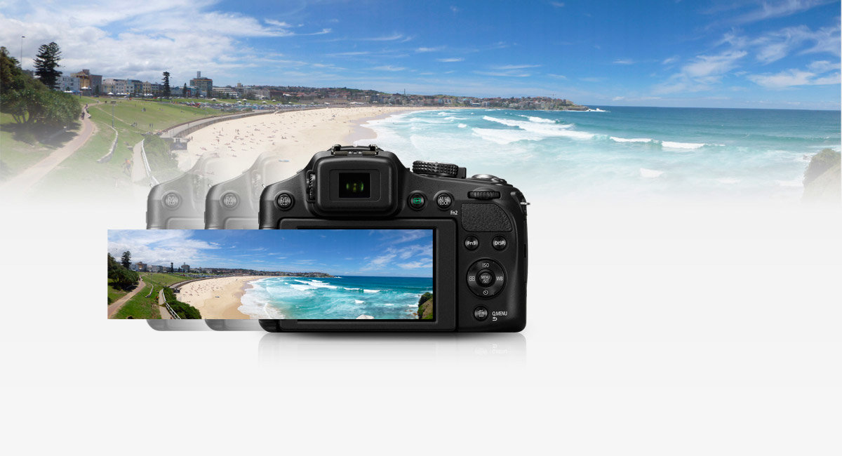 | Cyfrowy aparat z obiektywem Super-Zoom z pełnym zakresem 24-krotnego zoomu optycznego (przy F2.8) i dużej szybkości działania. |