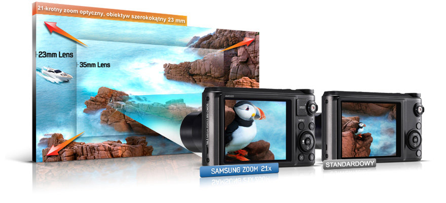 21-krotny zoom optyczny, obiektyw szerokokątny 23 mm Odkrywaj i rejestruj cały świat aparatem WB850F. 21-krotny zoom optyczny sprawia, że fotografie z dużej odległości są bardzo wyraźne. Teraz zrobisz zdjęcie ryczącego lwa z bezpiecznej odległości zarówno podczas wycieczki do zoo, jak i na wyprawie safari. WB850F wyposażony jest także z obiektyw szerokokątny 23 mm, pokazujący szersze pole widzenia niż nieuzbrojone oko ludzkie może zobaczyć. Rejestruj majestatyczne szczyty łańcucha górskiego jednym pstryknięciem migawki.