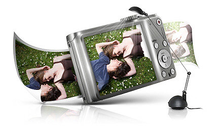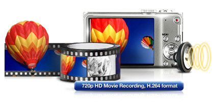 Możesz filmować w rozdzielczości HD 720 p, 30 klatek na sekundę, przy czasie nagrywania 4 razy dłuższym niż w przypadku filmów w formacie MJPEG. Funkcja SoundAlive, ze specjalną technologią redukującą szumy, zapewnia czysty dźwięk nagrywanych ścieżek.