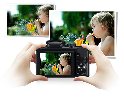 Optyczna stabilizacja obrazu Optyczna stabilizacja obrazu w aparacie Samsung WB2100 zapewnia doskonałą ostrość zdjęć, nawet jeśli fotografowi drżą dłonie. Możesz śmiało robić zdjęcia w dowolnych warunkach, a efekt zawsze będzie ostry i wyrazisty – niezależnie od tego, czy fotografujesz przy słabym oświetleniu, w dużym zbliżeniu, czy też w ruchu.