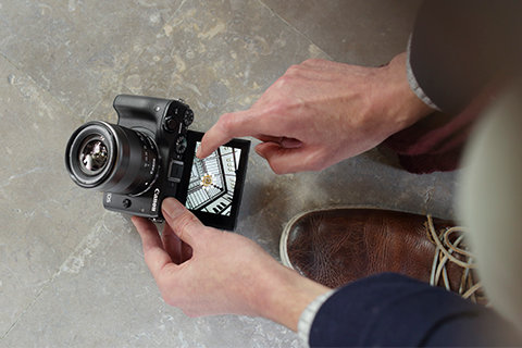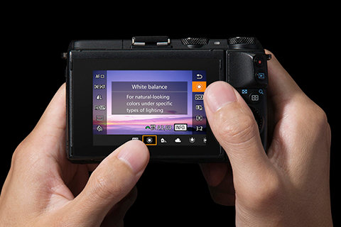 | Łatwy w obsłudze dotykowy interfejs Wielokrotnie nagradzany, ergonomiczny interfejs z intuicyjnym ekranem dotykowym (1040 tys. punktów sRGB) do ustawiania ostrości i wykonywania zdjęć jednym dotknięciem, obsługi menu i przyjemnego przeglądania obrazów. Ekran odchyla się do góry o 180˚ (przydatne do autoportretów) i w dół o 45˚, a to pozwala wykonywać zdjęcia z góry. |