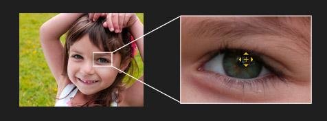 Pinpoint AF Funkcja Pinpoint AF pozwala ustawić powiększenie od 3x do 10x w stopniach 0,1x. Pomaga ona na przykład ustawić ostrość wprost na źrenicy w oku. |