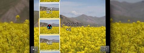 Przetwarzanie danych RAW w aparacie Aparat DMC-GH4 obsługuje funkcję wewnętrznego przetwarzania danych RAW. Oprócz ustawiania przestrzeni barw (sRGB / AdobeRGB) można w elastyczny sposób modyfikować balans bieli. kompensację ekspozycji, kontrast, obszary prześwietlone i cienie, nasycenie, poziom redukcji szumów, wyrazistość i odcień. Dostępne są także inne funkcje aparatu LUMIX: styl zdjęcia, sterowanie zakresem dynamicznym oraz inteligentne sterowanie rozdzielczością. |
