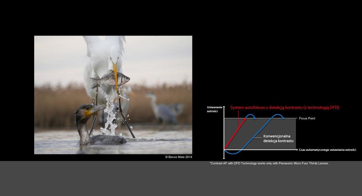 System autofokusu z detekcją kontrastu (z technologią DFD) System autofokusu z detekcją kontrastu korzysta obecnie z technologii DFD (Depth from Defocus), co znacznie skraca czas ustawiania ostrości. Wyznacza on odległość do fotografowanego obiektu przez analizę dwóch ujęć o różnej głębi ostrości i sprawdzenie parametrów optycznych za pomocą obiektywu. W efekcie udaje się osiągnąć szybkość autofokusu rzędu 0,07 s*. Poprawa jakości jest większa w przypadku większych odległości. *W trybie AFS, z obiektywem H-FS14140 lub H-HS12035