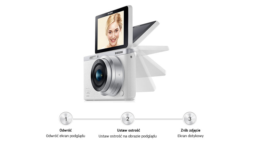Obrócenie dotykowego ekranu o przekątnej 3” w aparacie NX mini umożliwia wykonanie perfekcyjnego autoportretu. Obsługę ułatwia dotykowy interfejs użytkownika.