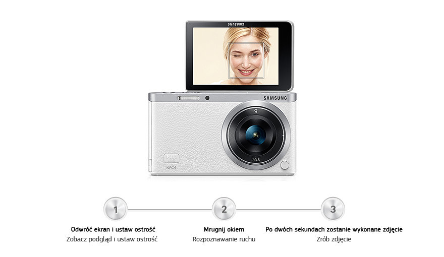NX mini sprawia, że wykonywanie autoportretów to świetna zabawa. Wystarczy mrugnąć okiem, aby po dwóch sekundach nastąpiło wykonanie zdjęcia. Nie musisz naciskać żadnego przycisku. Wystarczy uśmiech!