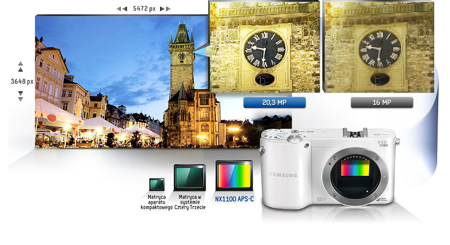 Matryca APS-C 20,3 megapiksela Zoptymalizowana pod kątem systemu NX, całkowicie nowa, profesjonalna matryca CMOS APS-C 20,3 Mpix umożliwia robienie zdjęć, które z powodzeniem konkurują ze zdjęciami wykonanymi lustrzankami typu premium. Każdemu pikselowi przypisany jest duży obszar matrycy, dzięki czemu dociera do niego więcej światła, co gwarantuje niski poziom szumów, duży zakres dynamiczny i precyzyjne rozróżnianie kolorów. Większa czułość umożliwia robienie zdjęć w słabym oświetleniu, bez efektu ziarnistości i szumów. Nowa matryca obsługuje również standard filmowania Full HD.
