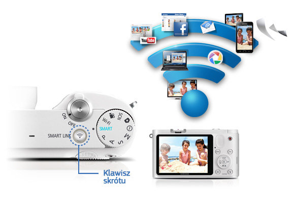 Wi-Fi (Smart Link) Zapomnij o konieczności noszenia ze sobą kabla. Wbudowane łącze Wi-Fi umożliwia natychmiastowe dzielenie się szczególnymi chwilami z rodziną i znajomymi, również w podróży. Teraz możesz publikować zdjęcia bezpośrednio z aparatu NX1100 w serwisie Facebook lub przesyłać je e-mailem do swoich bliskich. Dedykowany przycisk Smart Link ułatwia zapisywanie świeżo zrobionych zdjęć w dowolnym kompatybilnym modelu smartfona, co jeszcze bardziej poszerza możliwości udostępniania.