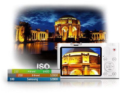 Duży zakres ISO (12800, 7 poziomów) Duży zakres wartości ISO sprawia, że oświetlenie przestaje być problemem. Możliwość robienia zdjęć przy wartości ISO 12800 w normalnych ustawieniach oznacza uzyskiwanie głębokich gradacji tonowych i rzeczywistych kolorów, nawet przy słabym oświetleniu. Dzięki dużemu zakresowi czułości zrobisz również wyraźne zdjęcia szybko poruszających się obiektów.
