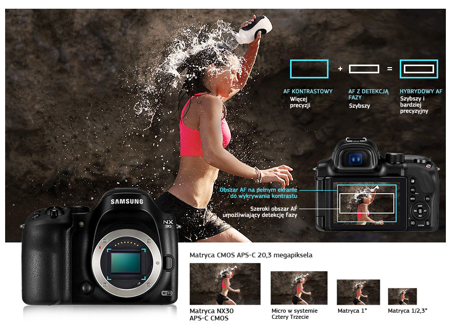 Wbudowany hybrydowy autofokus i największy czujnik wśród aparatów bezlusterkowych zapewniają idealne warunki do błyskawicznego wykonywania wysokiej jakości zdjęć, wzbogaconych o zachwycającą głębię ostrości i artystyczne rozmycia. System autofokusu łączy w sobie detekcję fazy i kontrastu co sprawia, że ostrość obrazu regulowana jest znacznie szybciej i dokładniej. Mierzący 23,5 x 15,7 mm sensor wychwytuje więcej światła, tworząc piękne, wolne od zakłóceń zdjęcia i filmy. Dzięki niesamowicie niskiemu czasowi reakcji migawki NX30 znacznie szybciej uchwycisz najdynamiczniejsze sceny.