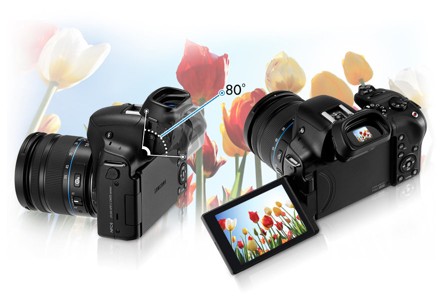 Odchylany elektroniczny wizjer posiada rozdzielczość aż 2 359 tys. punktów i zapewnia stuprocentowe pokrycie kadru, dzięki czemu dokładnie widzisz to, co fotografujesz. Zaawansowana technologia OLED zastosowana w wyświetlaczu Full VGA Super AMOLED 75 mm (3") zapewnia niesamowicie żywe kolory, doskonały kontrast i wyraźny pogląd bez rozmazań. Obrotowy wyświetlacz odchyla się w górę i w dół w zakresie 270°, a także obraca się w płaszczyźnie poziomej w zakresie 180°, dzięki czemu możesz kadrować i wykonywać niesamowite fotografie. Ponadto jasność ekranu zapewnia doskonałą widoczność, nawet w świetle słonecznym.