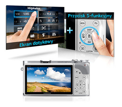 Hybrydowy interfejs użytkownika (ekran dotykowy i przycisk 5-funkcyjny) Aparat Samsung SMART NX300 oferuje wiele opcji, również w kwestii nawigacji po menu za pomocą ekranu WVGA o przekątnej 3,31 cala (84 mm). Intuicyjny hybrydowy dotykowy interfejs użytkownika to połączenie 5-funkcyjnego przycisku z ekranem dotykowym, umożliwiające szybkie wybieranie opcji menu służących do szybkiej edycji i udostępniania zdjęć, wprowadzania tekstu i nie tylko. Niezależnie od tego, czy klikasz na ekranie, czy poruszasz się wskaźnikiem, wszystko stało się łatwiejsze i szybsze.