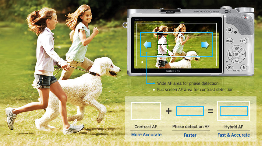 Zaawansowany hybrydowy autofocus Hybrydowy autofocus łączy w sobie system fazowy i kontrastowy, sprawiając że aparat ustawia ostrość szybciej i precyzyjniej. Autofocus fazowy niemal natychmiast ustala odległość od fotografowanego obiektu, a autofocus kontrastowy dostosowuje ostrość, zapewniając maksymalny kontrast. Dzięki niesamowicie krótkiemu opóźnieniu migawki hybrydowy autofocus umożliwia robienie precyzyjnych i bogatych w detale zdjęć o wiele szybciej.