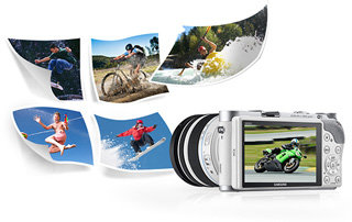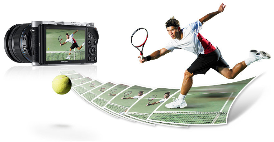 Tryb szybkich zdjęć 8,6 kl./s Gdy robisz zdjęcia wartkiej akcji, chcąc uchwycić na przykład tenisistę, który odbija piłkę tuż przy siatce, warto skorzystać z trybu robiącego kilka doskonale wyraźnych zdjęć klatka po klatce. Samsung SMART CAMERA NX300 pozwala robić zdjęcia seryjne z zawrotną szybkością 8,6 klatek na sekundę – dzięki temu na pewno uda ci się uwiecznić wymarzone ujęcie. Zaawansowany autofocus zapewnia doskonałą ostrość w przypadku zdjęć szybko poruszających się obiektów. Z kolei krótsze opóźnienie migawki pomaga uchwycić ulotne chwile, zanim fotografowany obiekt zniknie z kadru.