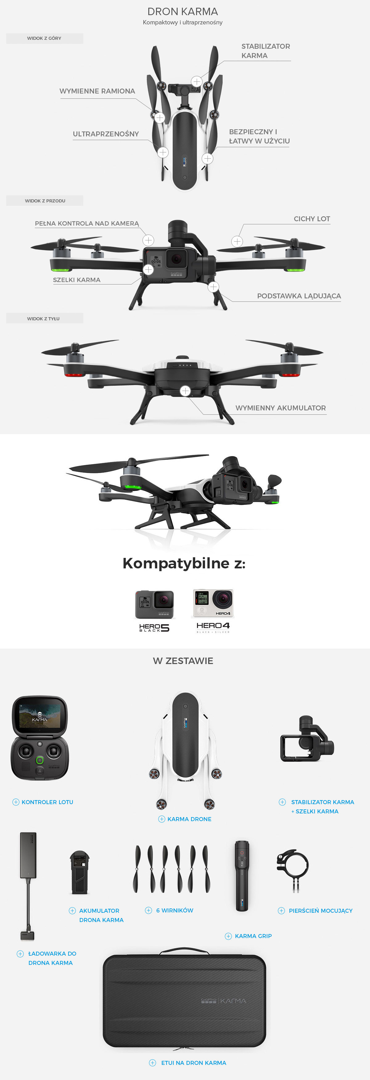 KARMAWięcej niż dron.System Karma™ umożliwia nagrywanie niewiarygodnie płynnego materiału filmowego GoPro z powietrza, kamerą trzymaną w ręce lub zamocowaną na ciele. Kompaktowy i ultraprzenośny dron Karma po złożeniu mieści się w przeznaczonym dla niego lekkim etui. Kontroler lotu w stylistyce gamepada z wbudowanym wyświetlaczem dotykowym pozwala na łatwe i przyjemne pilotowanie drona Karma. Więcej niż dron. To Karma.