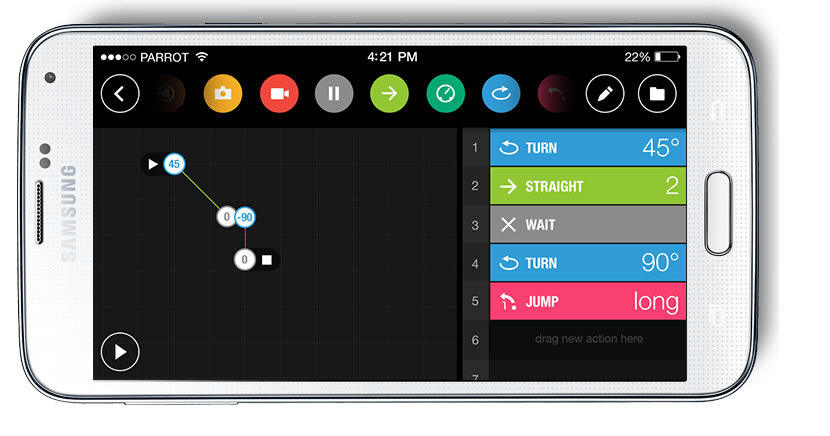 Bezpłatna aplikacja FreeFlight 3 zapewnia intuicyjne sterowanie za pośrednictwem smartfonu lub tabletu. Aplikacja nawiązuje z Jumping Sumo łączność Wi-Fi® - dron generuje własną sieć 2,4 i 5 Ghz. Aplikacja jest kompatybilna ze smartfonami i tabletami wyposażonymi w systemy operacyjne iOS, Android i Windows Phone. Pełni ona równocześnie rolę aplikacji MiniDrone Rolling Spider.
