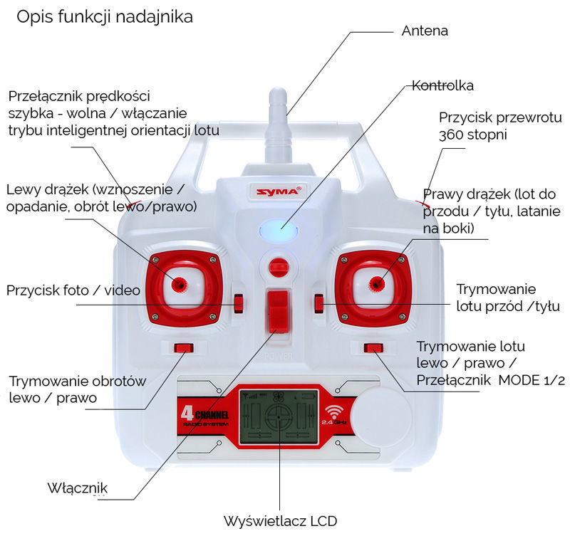 Dron Syma X8HC to model typu RTR, gotowy do lotu natychmiast po wyjęciu z pudełka. Jedyne, czego potrzebujesz, to 4 baterie AA do nadajnika. Odkryj nowy wymiar radości z latania, wybierz Symę X8HC!