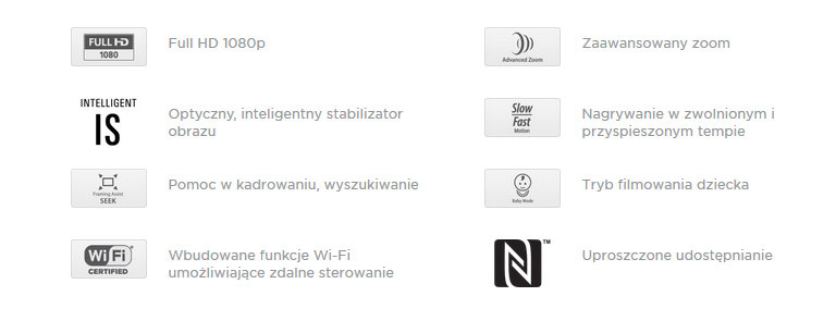 Łatwe nagrywanie i udostępnianie Ergonomiczna konstrukcja i prosta obsługa z poziomu ekranu dotykowego umożliwiają dłuższą pracę bez uczucia dyskomfortu. Tryb automatycznej pracy zapewni znakomicie wyglądające filmy, które będzie można z łatwością udostępnić dzięki łączności Wi-Fi z funkcją NFC. |