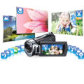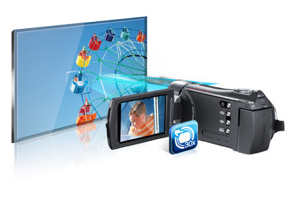 Szeroki 3-calowy wyświetlacz LCD Dzięki szerokiemu wyświetlaczowi LCD 3,0 cala zobaczysz wszystko, co nagrywasz, nawet jeśli znajdujesz się obok kamery. Szerszy kąt widzenia wyświetlacza LCD sprawia, że masz do dyspozycji wyraźny obraz na ekranie podczas nagrywania, nawet jeśli patrzysz na niego z boku, z dołu lub z góry.