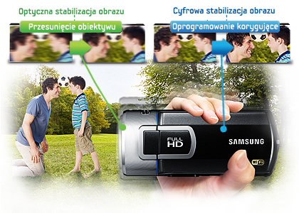 OIS Duo + Za sprawą funkcji OIS (optycznej stabilizacji obrazu) Duo + możesz nagrywać wyraźne i nieporuszone filmy, nawet jeśli Twoje ręce nie mają podparcia. H400 łączy wbudowaną funkcję optycznej stabilizacji z technologią stabilizacji cyfrowej, pozwalając na uniknięcie potknięć, szarpnięć i drżenia spowodowanych niewyraźnym obrazem. OIS Duo + zapobiega także zniekształceniom obrazu spowodowanym przemieszczaniem się osoby trzymającej kamerę, a także zmianą zoomu cyfrowego.