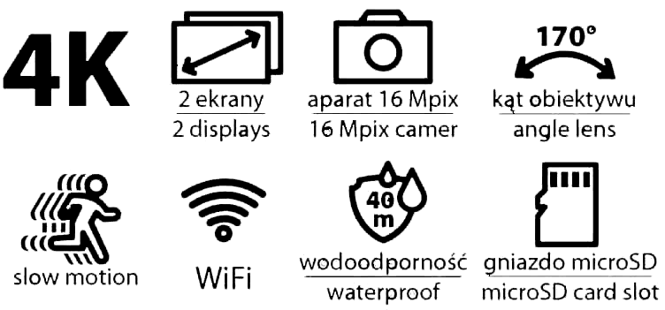 Wielofunkcyjna kamera! Kamera zapisuje filmy w rozdzielczości Ultra HD 4K (3200x1800 pikseli) z szybkością 30 k/s na kartach MicroSD. Została wyposażona w czytelny kolorowy wyświetlacz LCD o przekątnej ekranu 2". Charakteryzuje się szerokim kątem widzenia 170 stopni oraz wysoką rozdzielczością zdjęć 16Mpix. Bezproblemowo łączy się za pomocą WiFi ze smartfonem. Na wyposażeniu zestawu składają się uchwyty i wzmocniona obudowa, którą cechuje niespotykana odporność na kurz, wodę (wodoszczelna do 40m) oraz wstrząsy. |